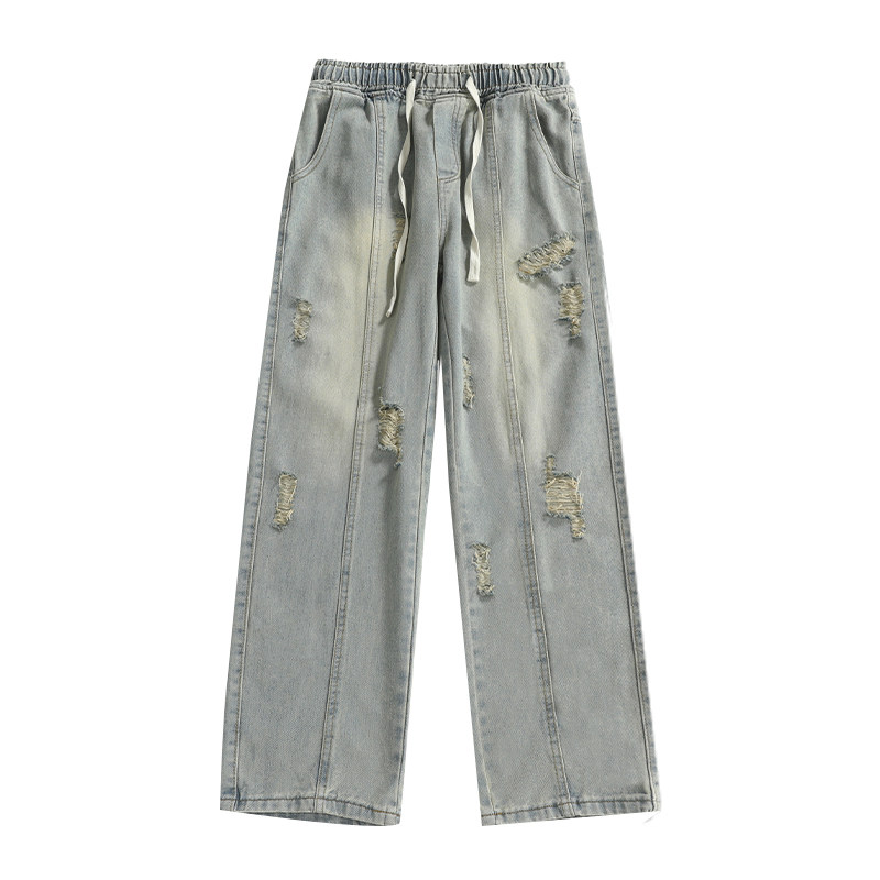 美式高街破洞直筒牛仔裤男复古