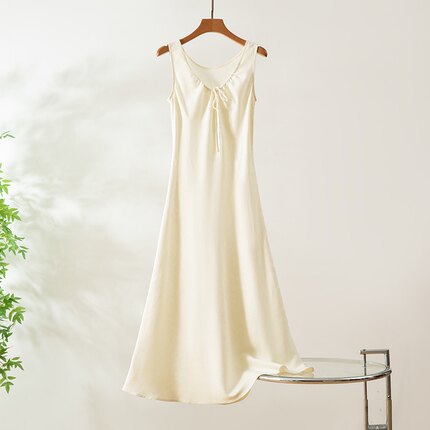 法式温柔风真丝绢丝绑带连衣裙女复古抽绳设计白色气质修身长裙