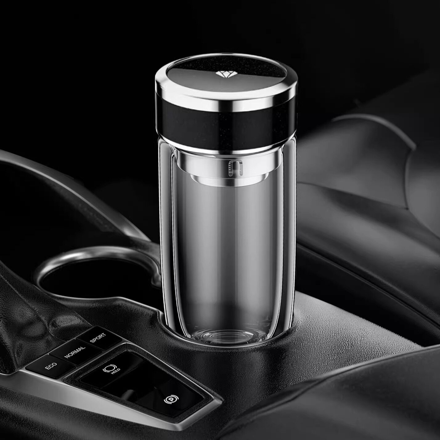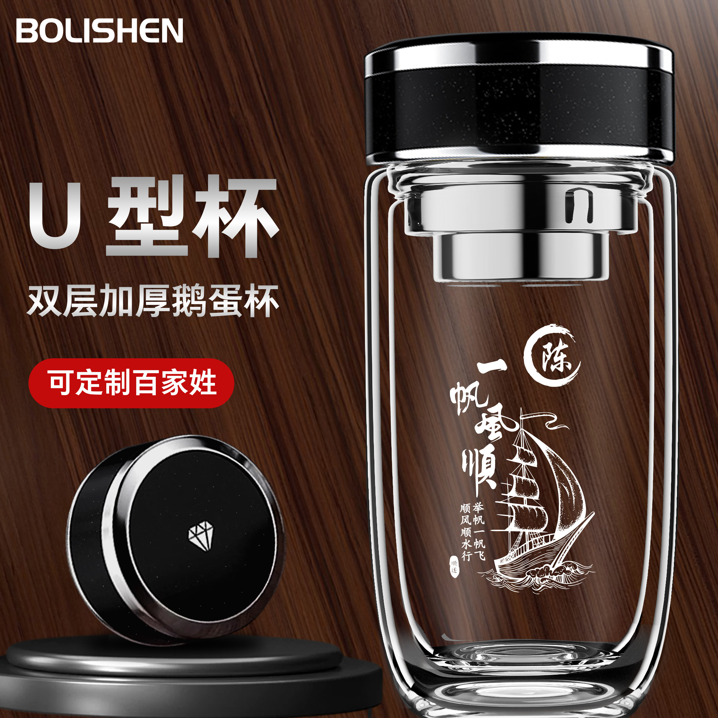 定制logo激光刻字百家姓双层鹅蛋玻璃杯高档商务杯茶水分离泡茶杯