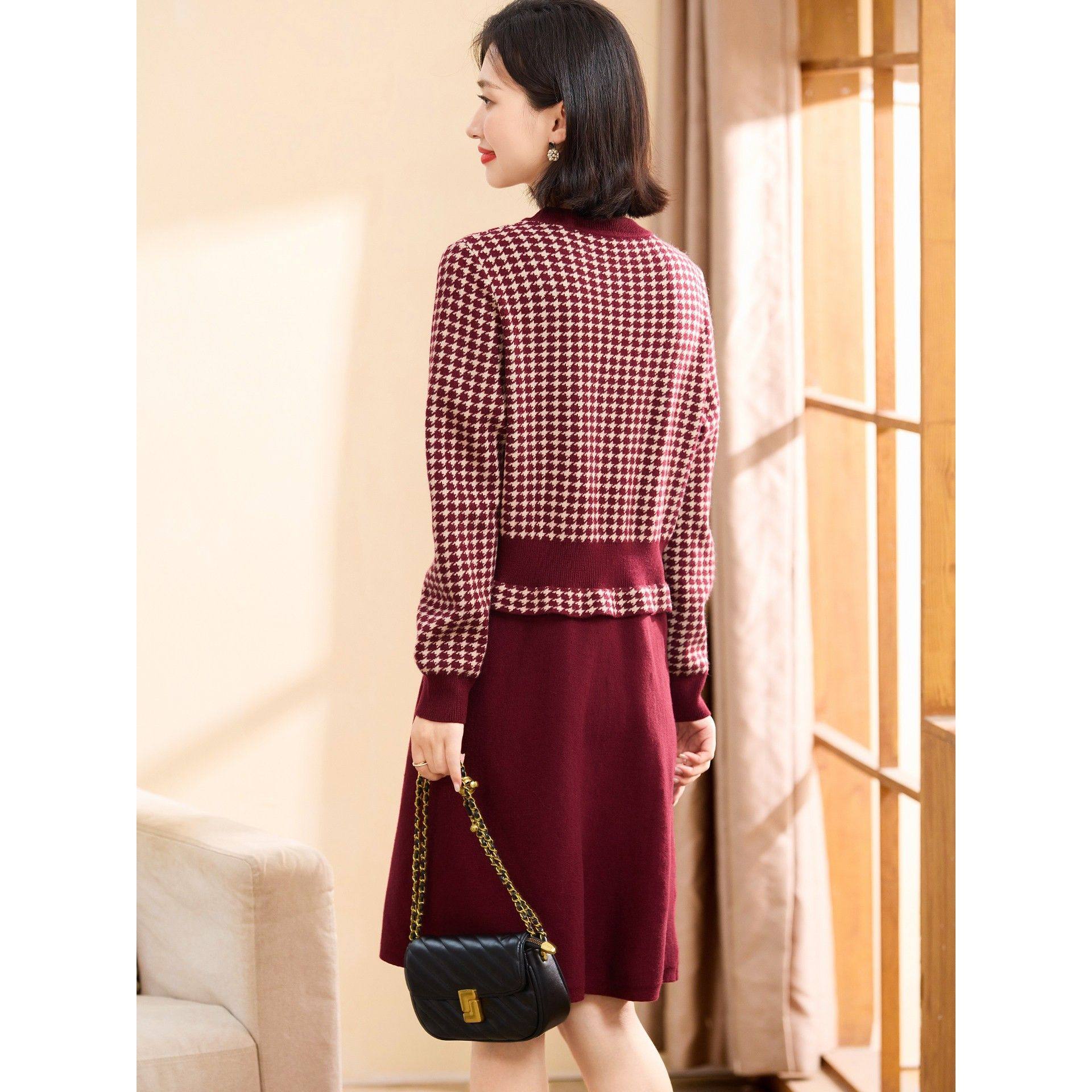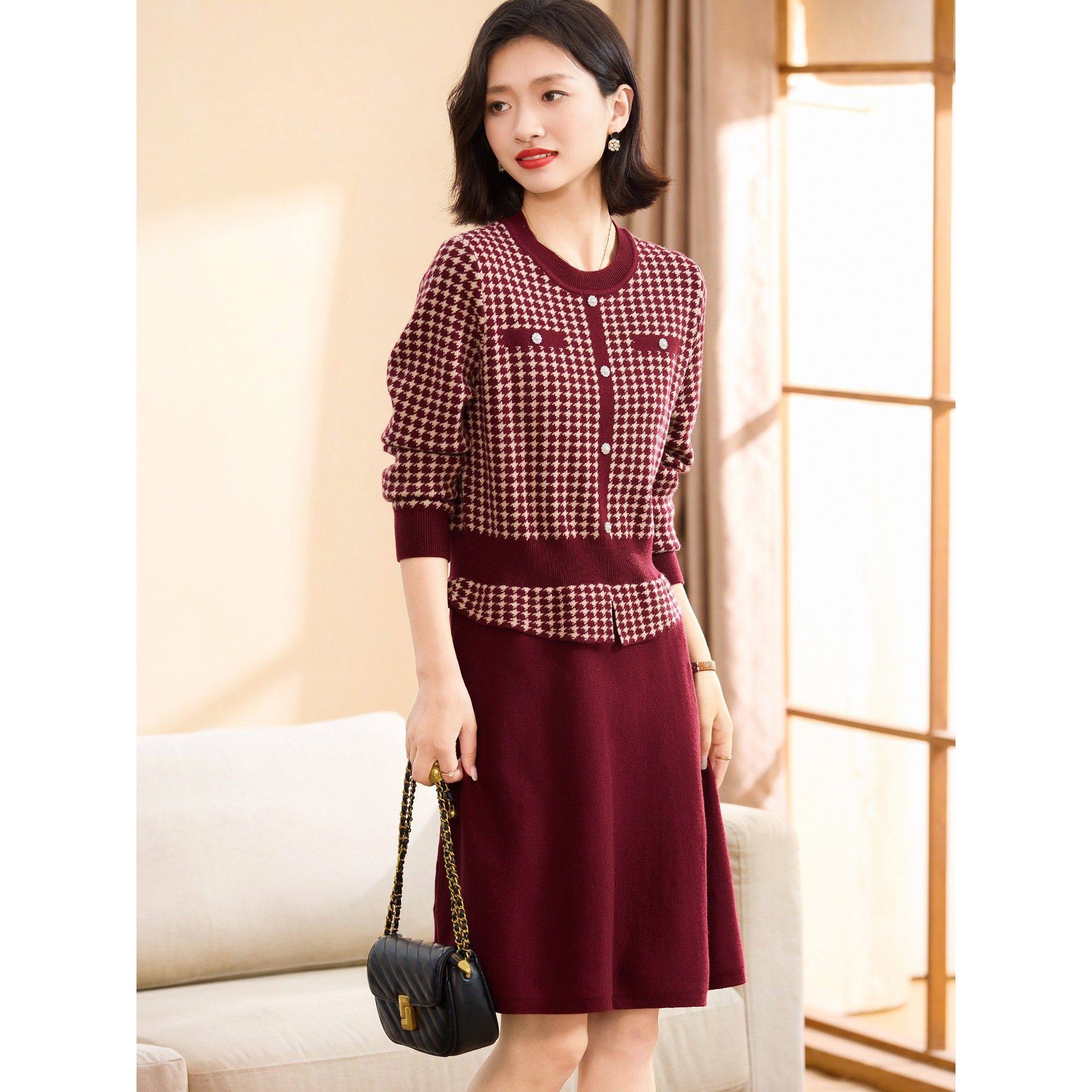 喜卉妈妈装秋冬针织连衣裙洋气质千鸟格毛衣裙中老年女装打底裙子