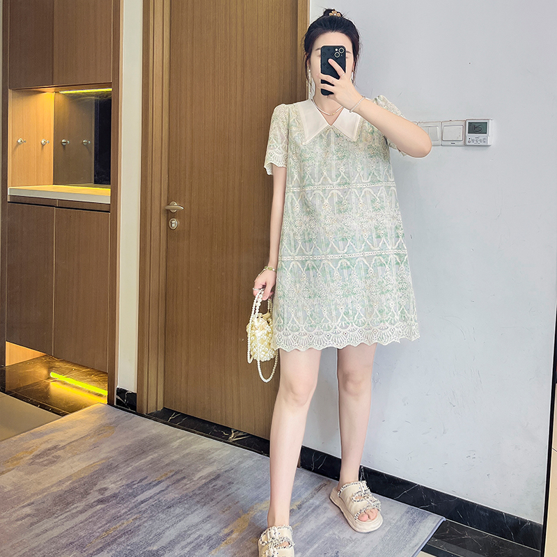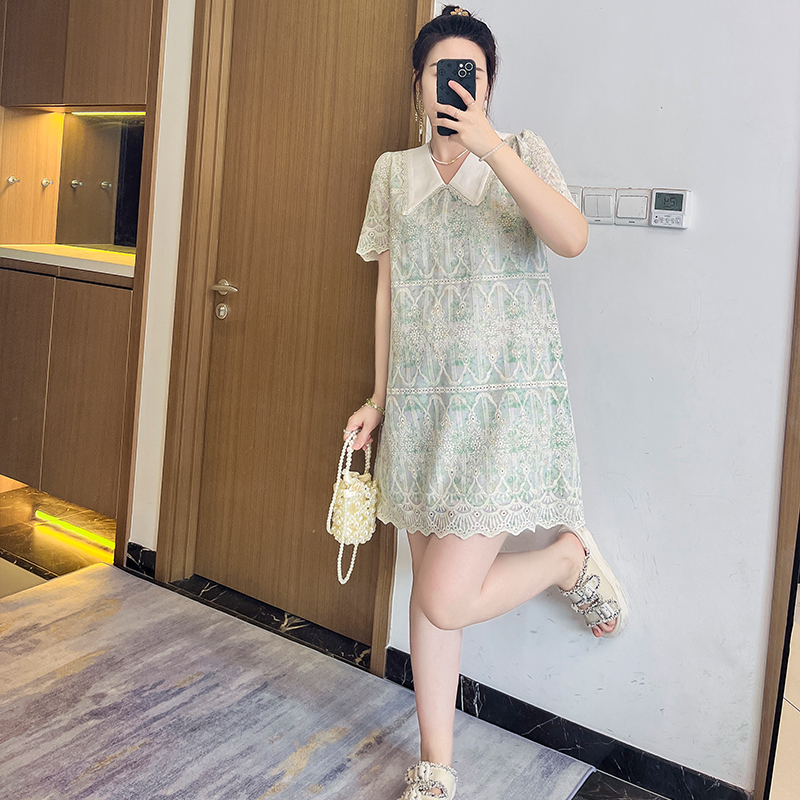 小个子v领连衣裙女夏季2025新款高级感法式气质蕾丝减龄大码胖mm