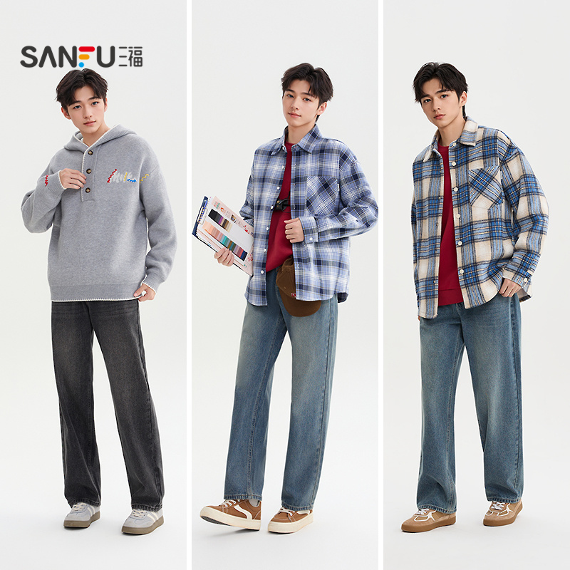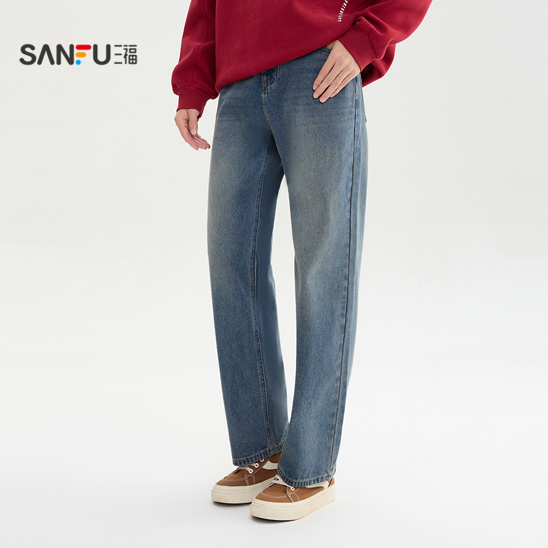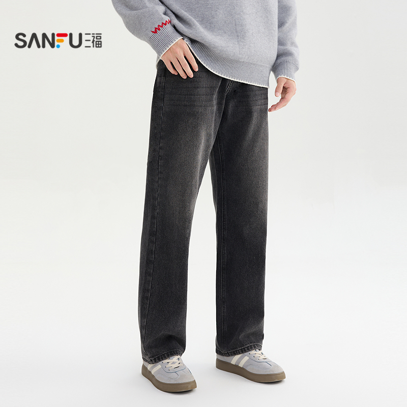 三福2025冬季男士经典猫须洗水牛仔裤 休闲宽松直筒裤子510084