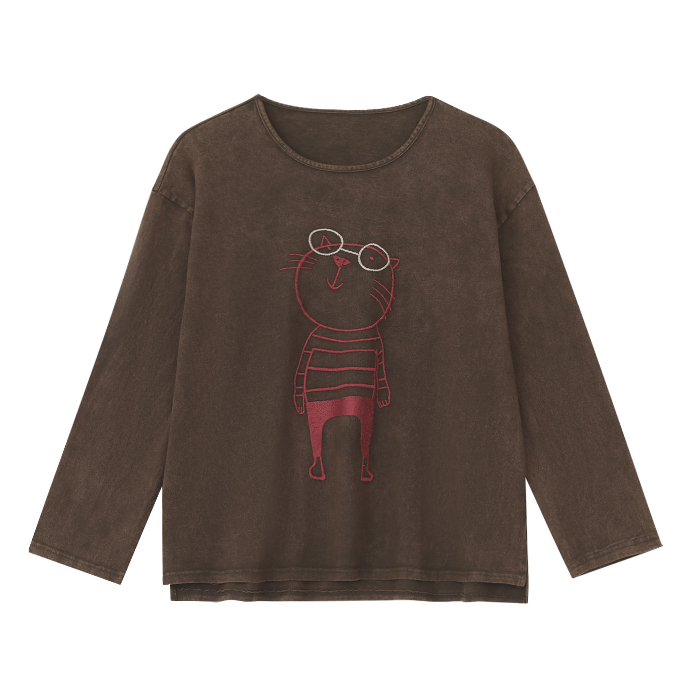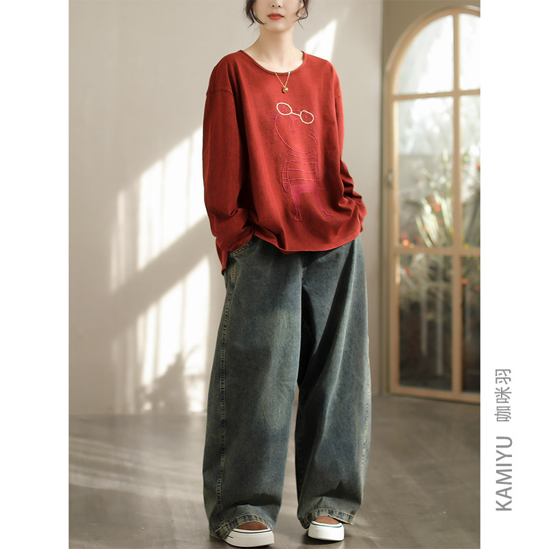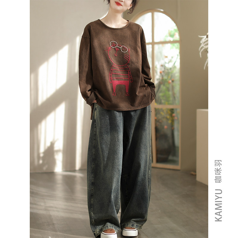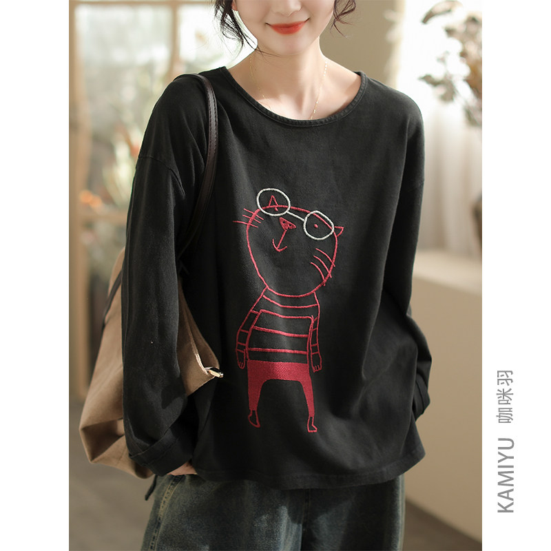 咖咪羽打底衫女春装新款休闲卡通印花原创全棉文艺女装长袖T恤女