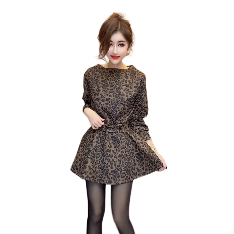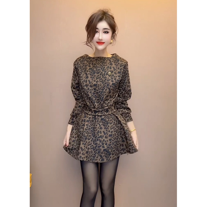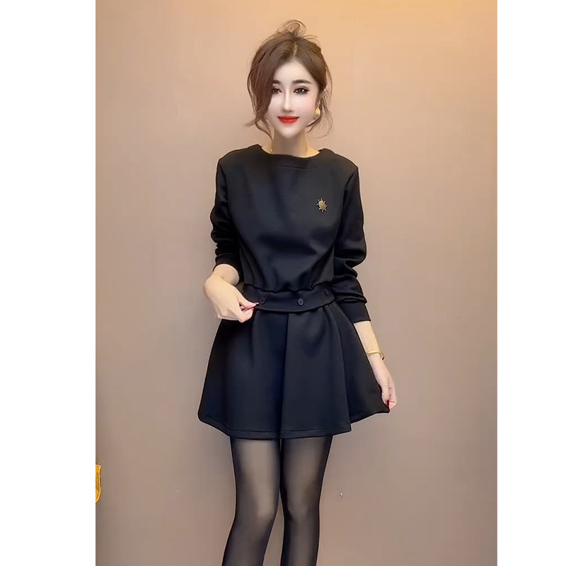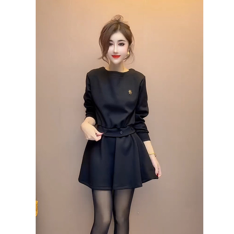高端时尚女神范连衣裙女秋冬季新款长袖圆领收腰显瘦中长款裙子潮