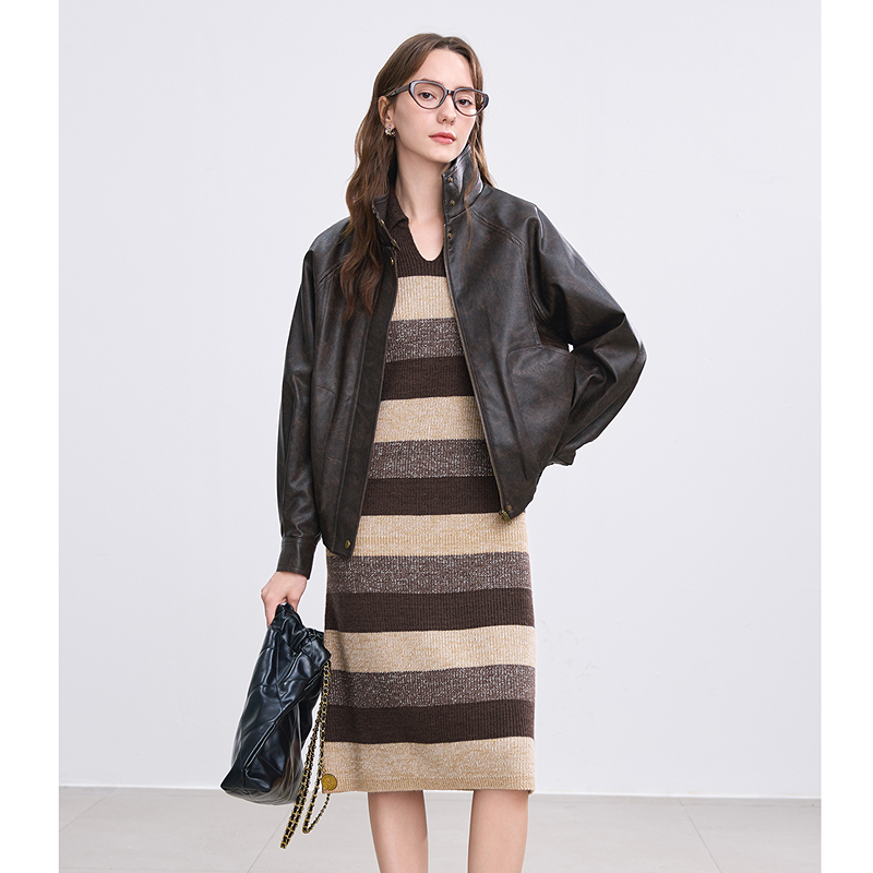 betu百图复古咖啡宽条纹毛衣裙2024年冬季新款中长裙针织连衣裙