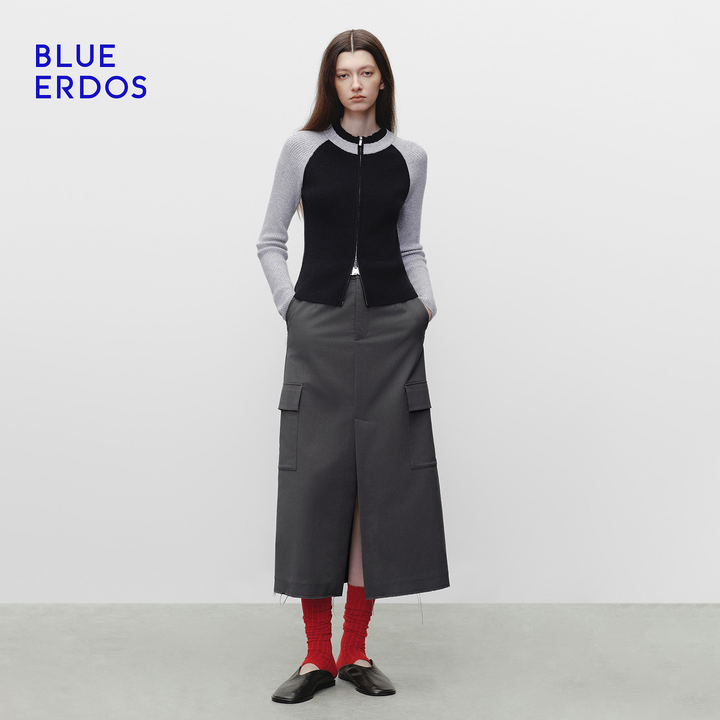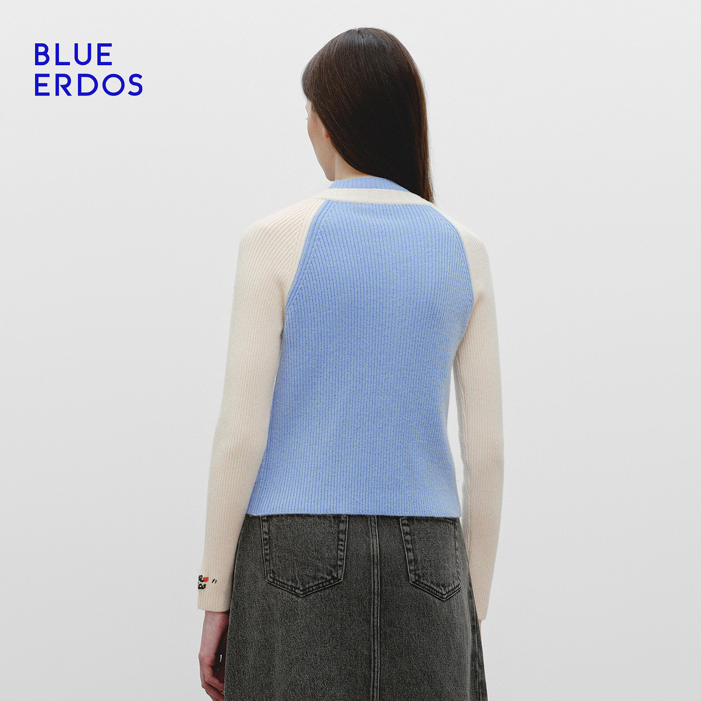 BLUE ERDOS冬季新品简约通勤半高领羊毛羊绒撞色刺绣女针织开衫