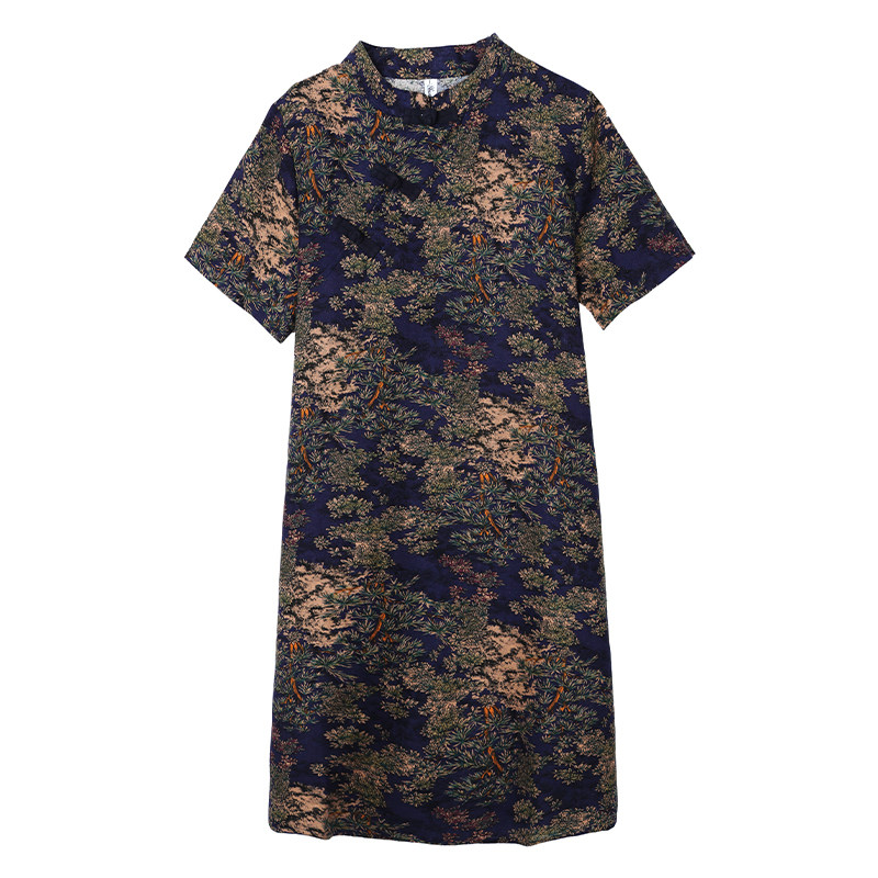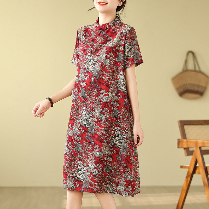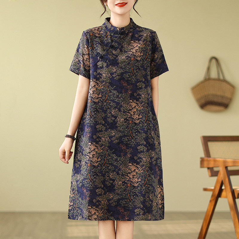 夏装复古文艺新中式改良旗袍宽松中长款连衣裙女立领印花裙子流行