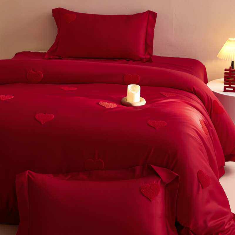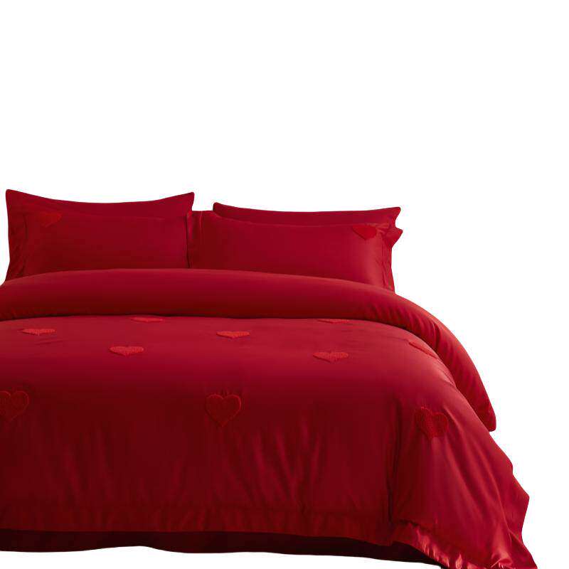 高档中式婚庆四件套大红色喜字床单被套纯棉结婚床上用品婚房陪嫁