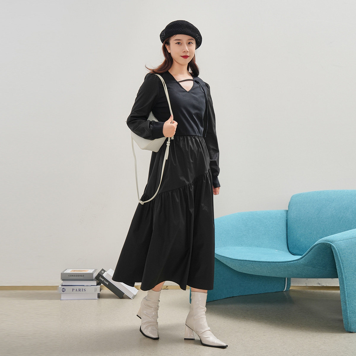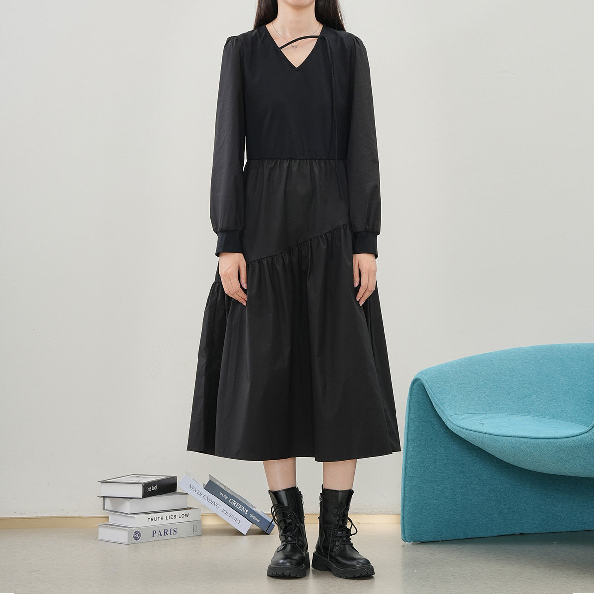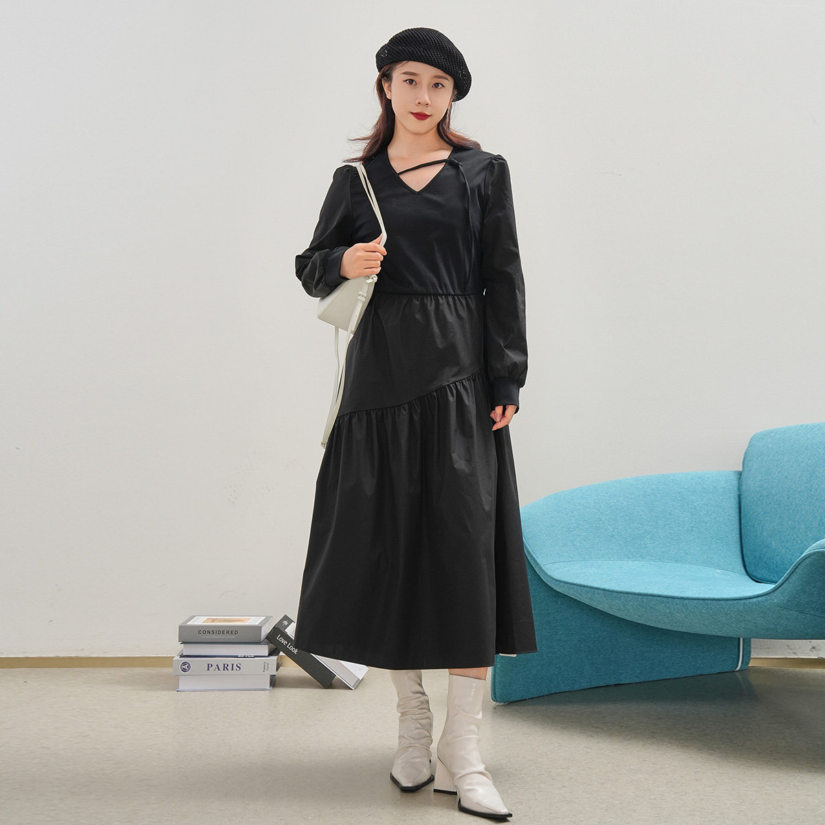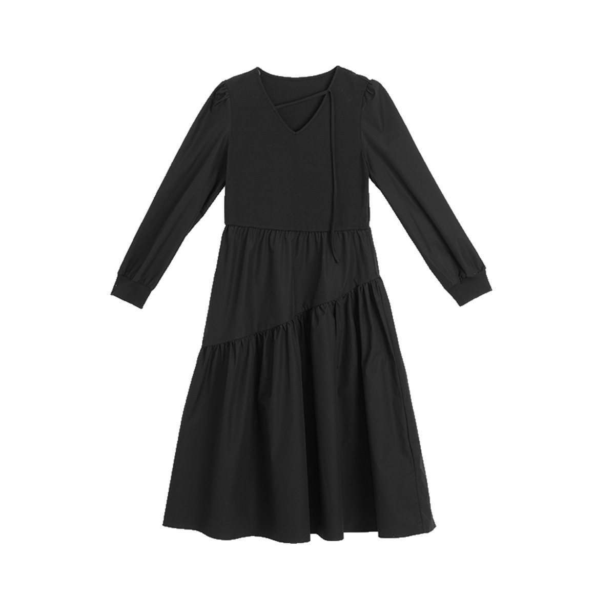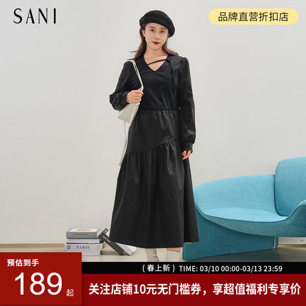 SANI2026秋季气质显瘦长袖连衣裙通勤V领A字裙泡泡袖收腰中长裙女