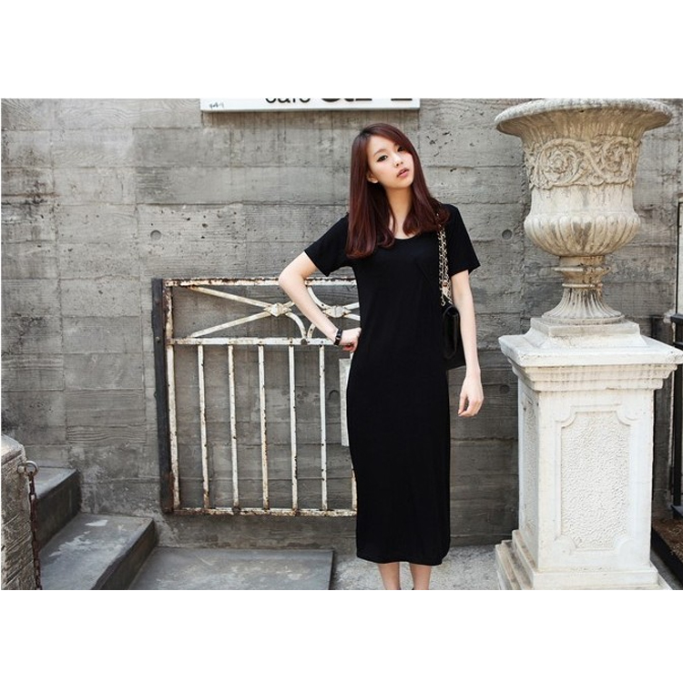 欧美风街拍夏秋装女莫代尔宽松过膝侧开叉长裙短袖连衣裙大码小码