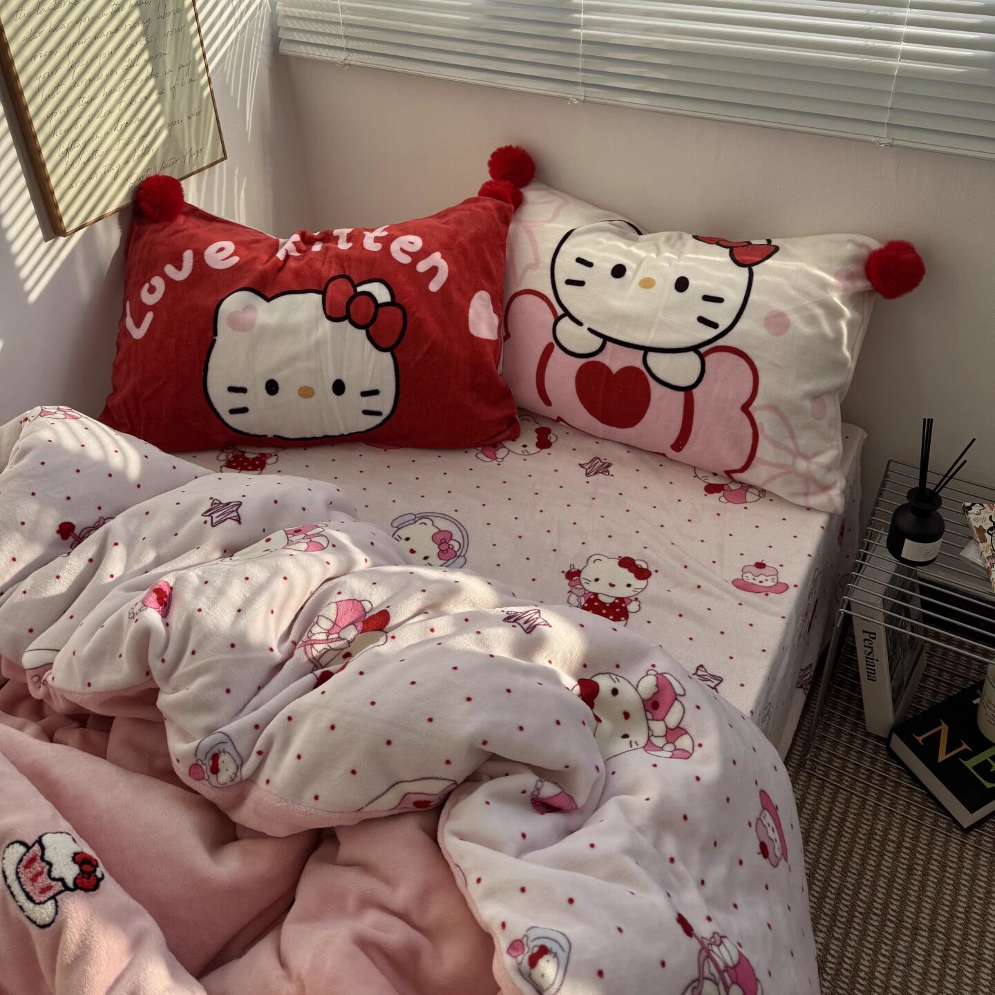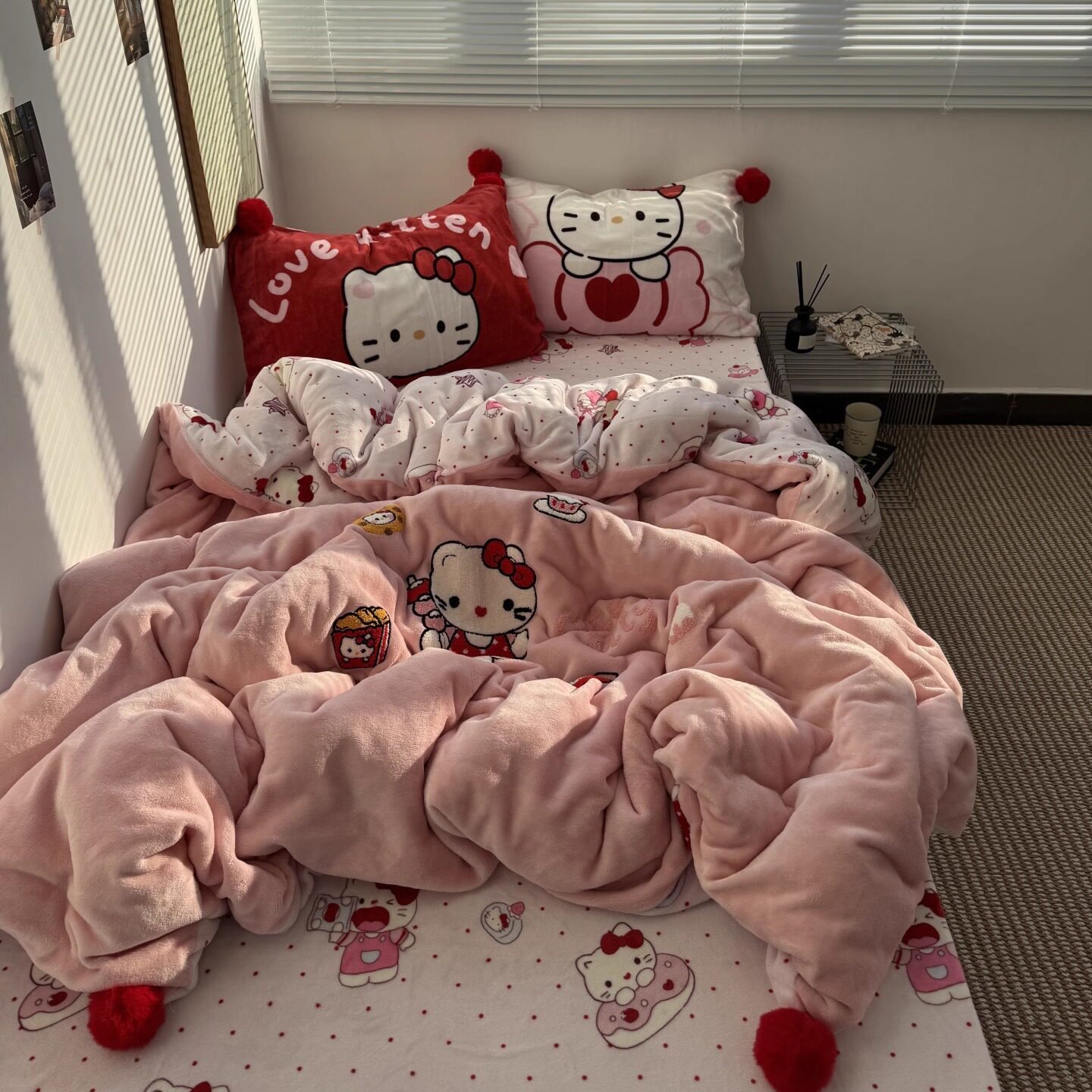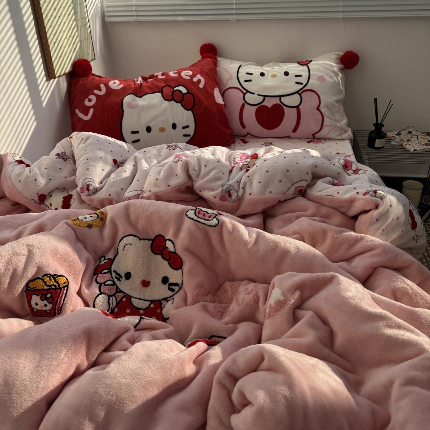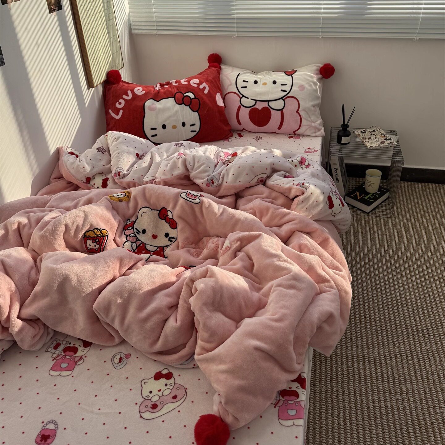 少女心ins可爱Kt喵毛巾绣牛奶绒毛球款四件套秋冬加厚珊瑚绒被套