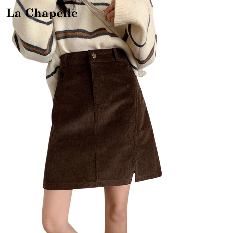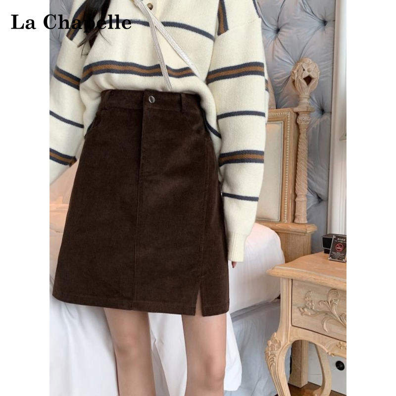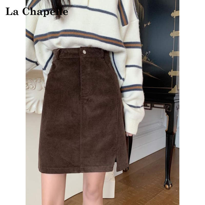 拉夏贝尔咖色复古灯芯绒半身裙女秋冬新款遮胯高腰a字包臀短裙子