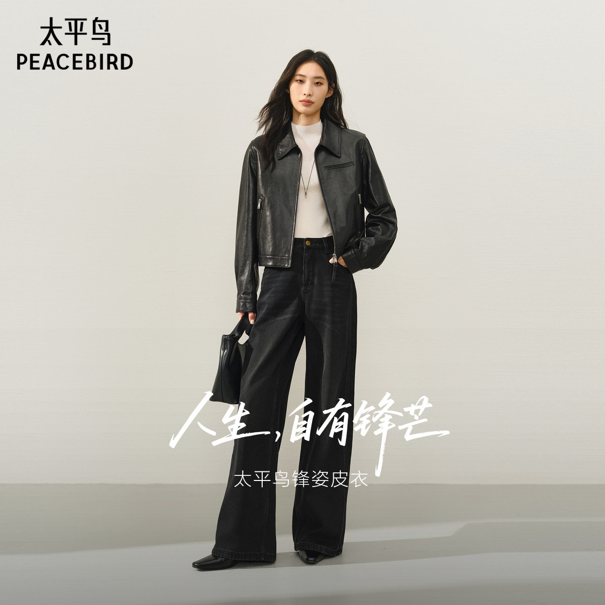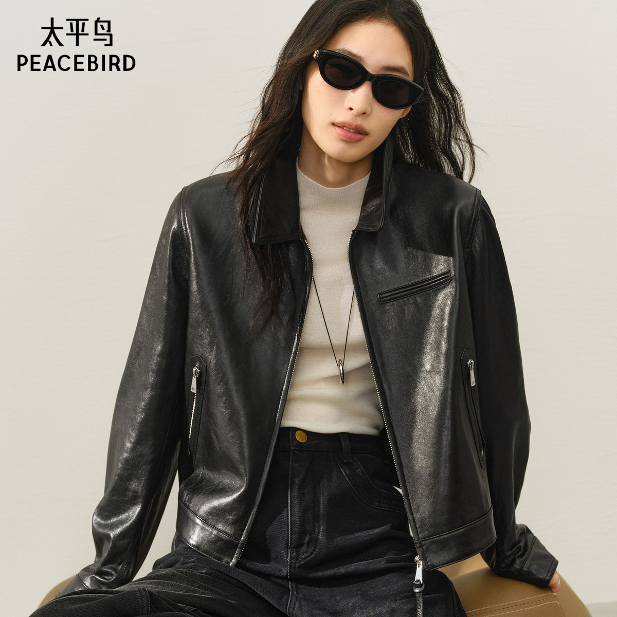 【张婧仪同款】太平鸟锋姿黑金真皮皮衣25极简廓形外套A1BDF4143*