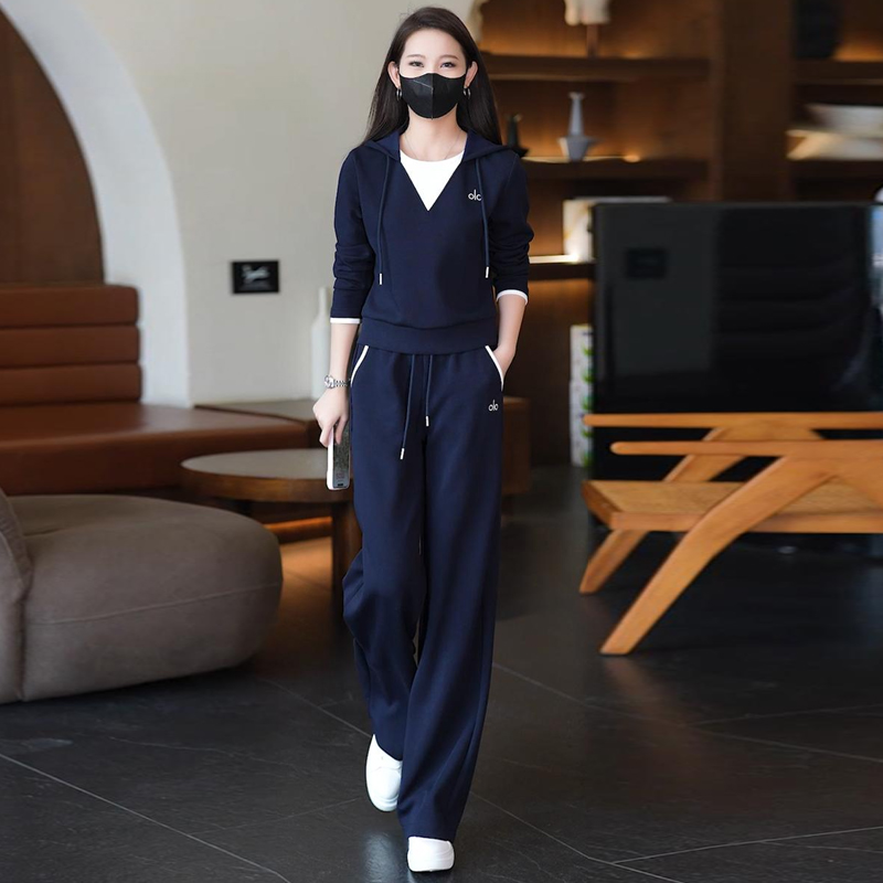休闲运动套装女2025秋季新款百搭显瘦假两件卫衣外套阔腿裤两件套