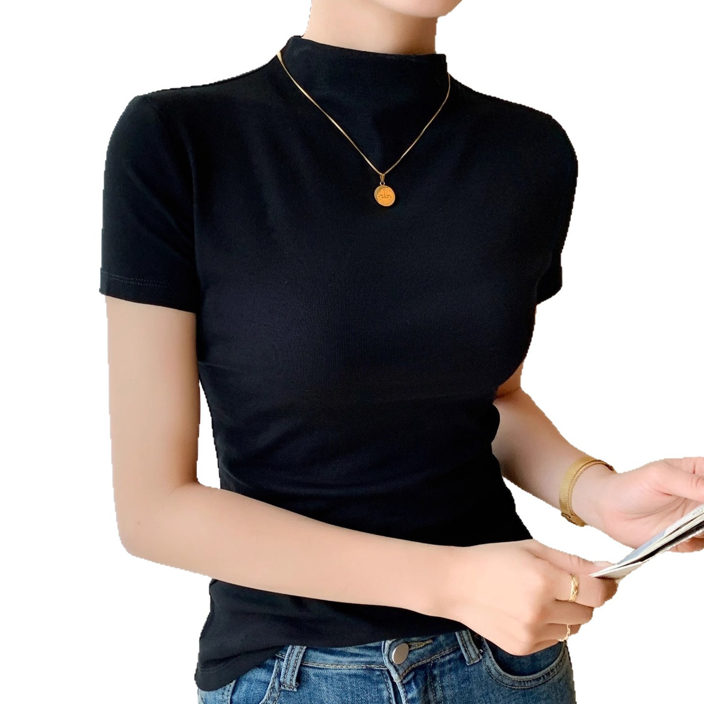半高领短袖打底衫女内搭春夏秋薄款纯棉t恤修身小衫气质短袖上衣