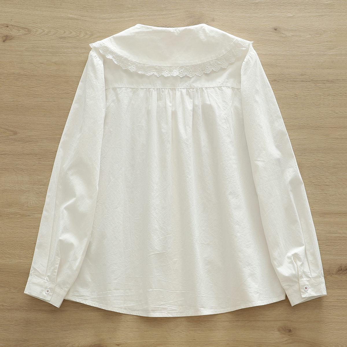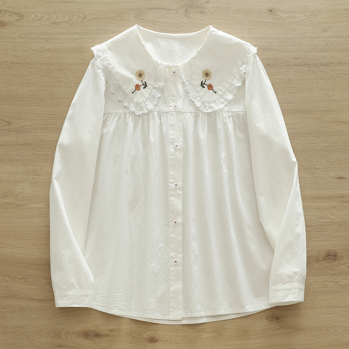 日系清新文艺蕾丝花边娃娃领刺绣衬衫女长袖学生甜美宽松纯棉衬衣
