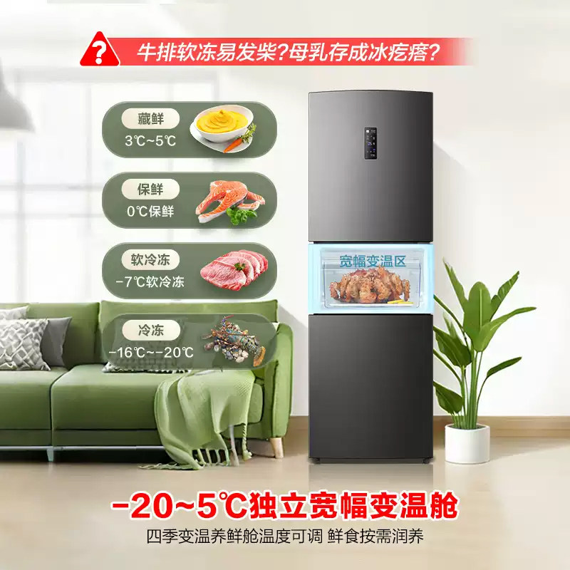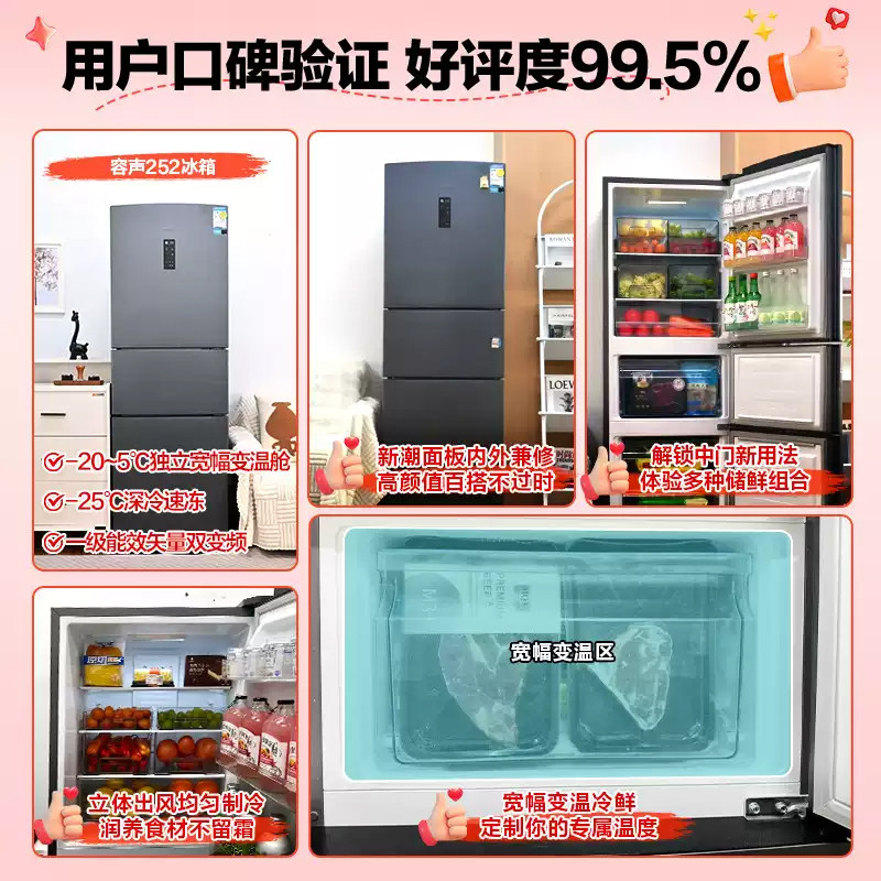 容声252L一级能效三开门变频无霜家用小型租房电冰箱以旧换新193