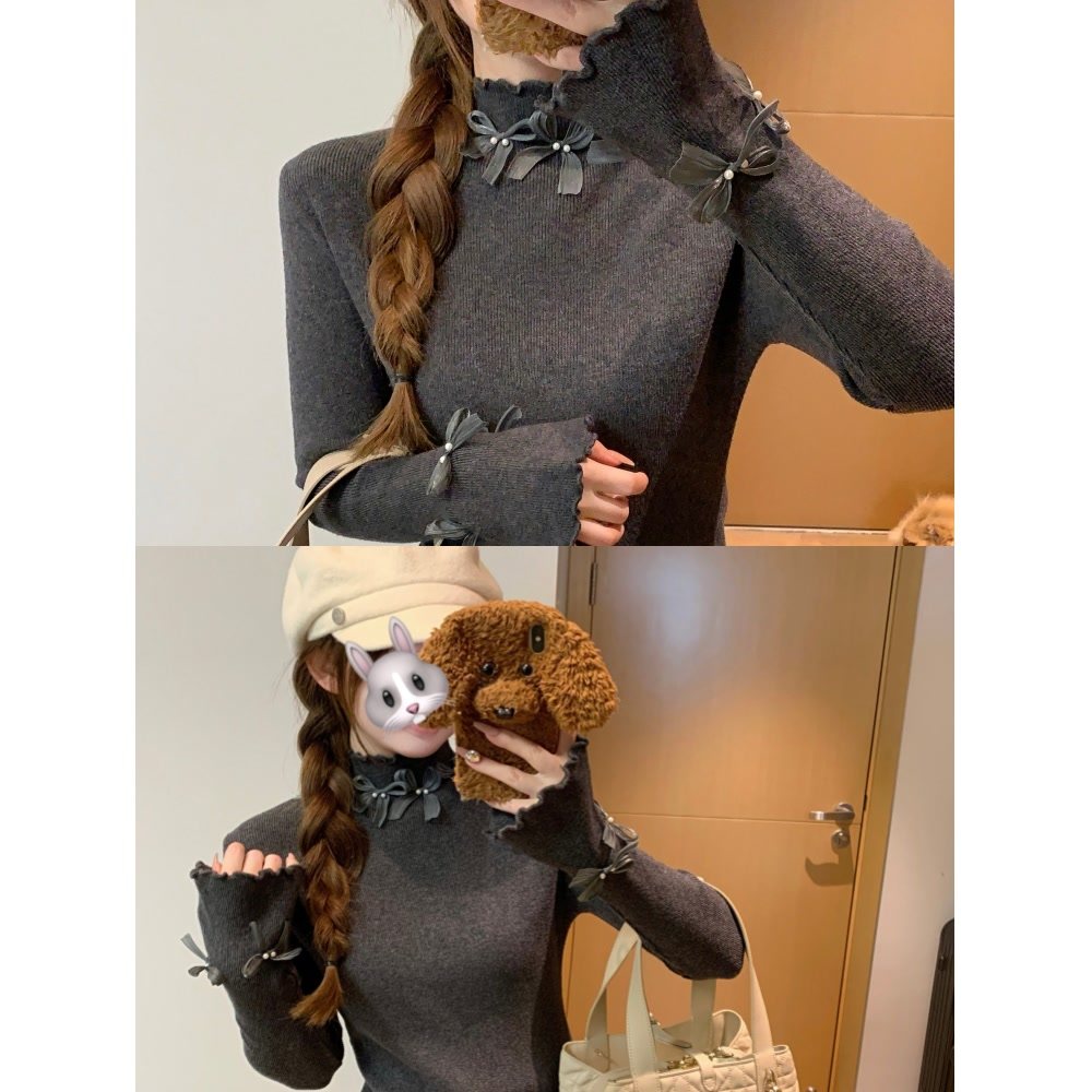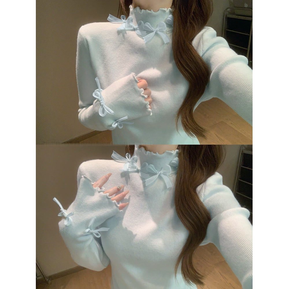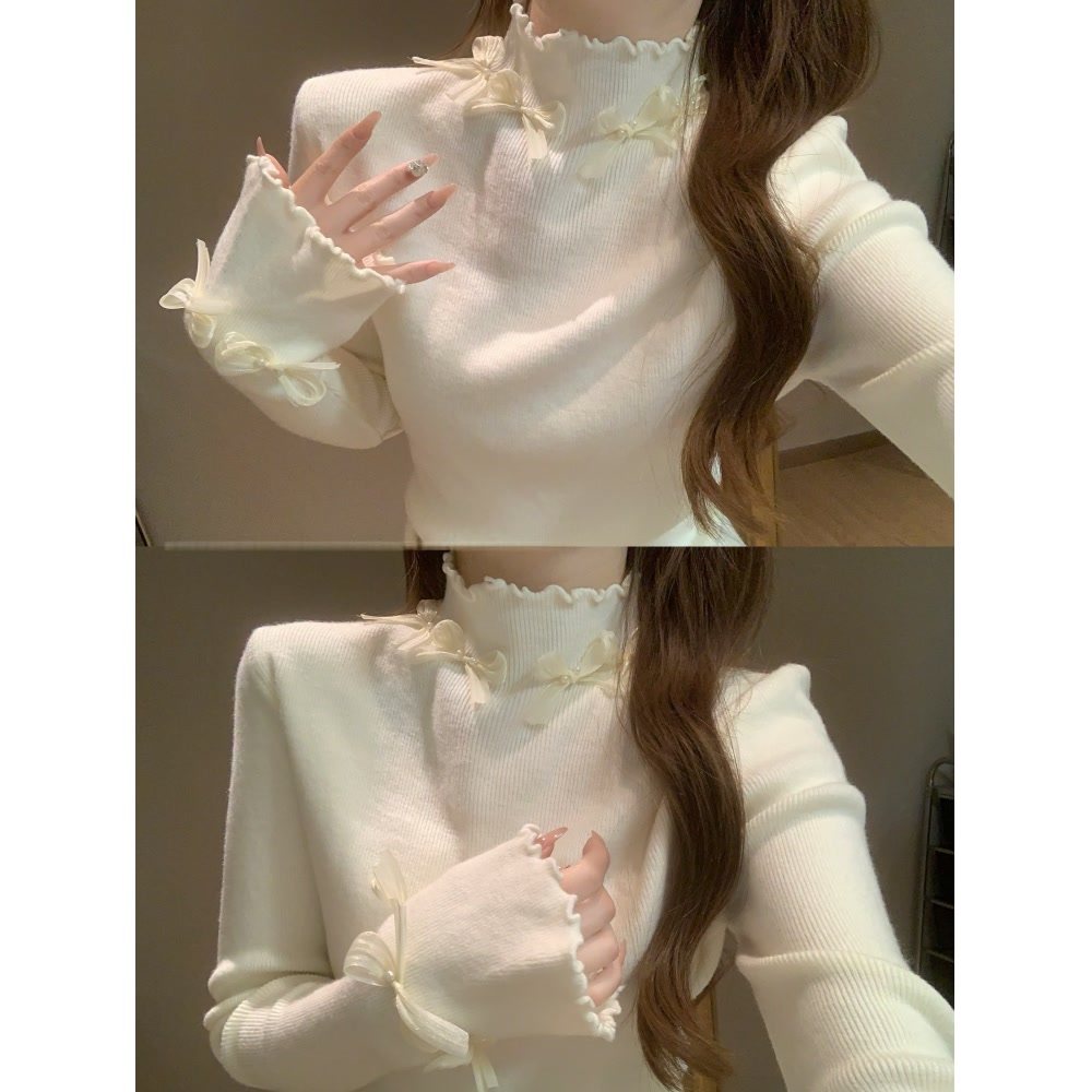 法式半高领蝴蝶结针织毛衣女冬季新款温柔气质修身打底喇叭袖上衣