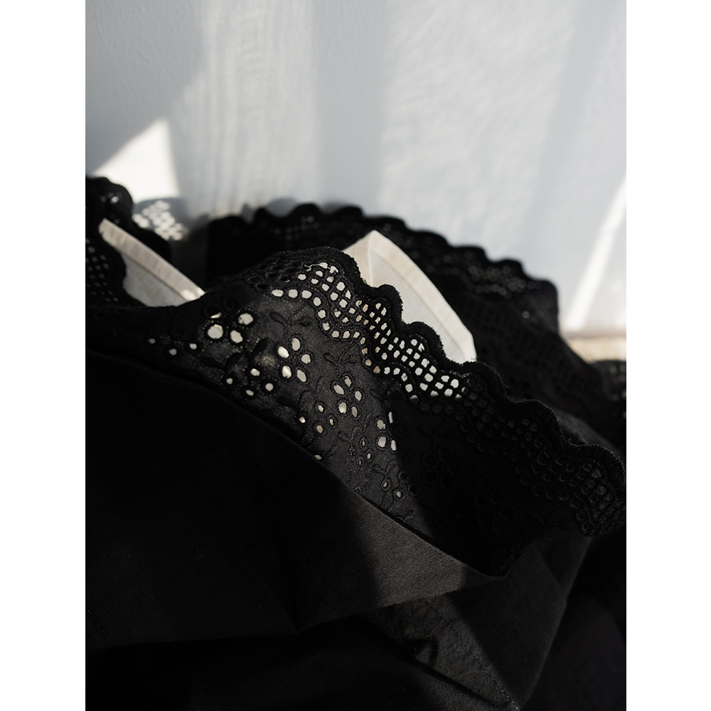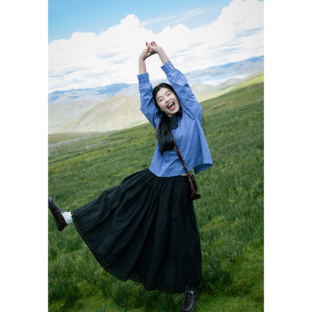 古苔 100分黑色蕾丝拼接半身裙2025早秋纯色中长款日系文艺百褶裙
