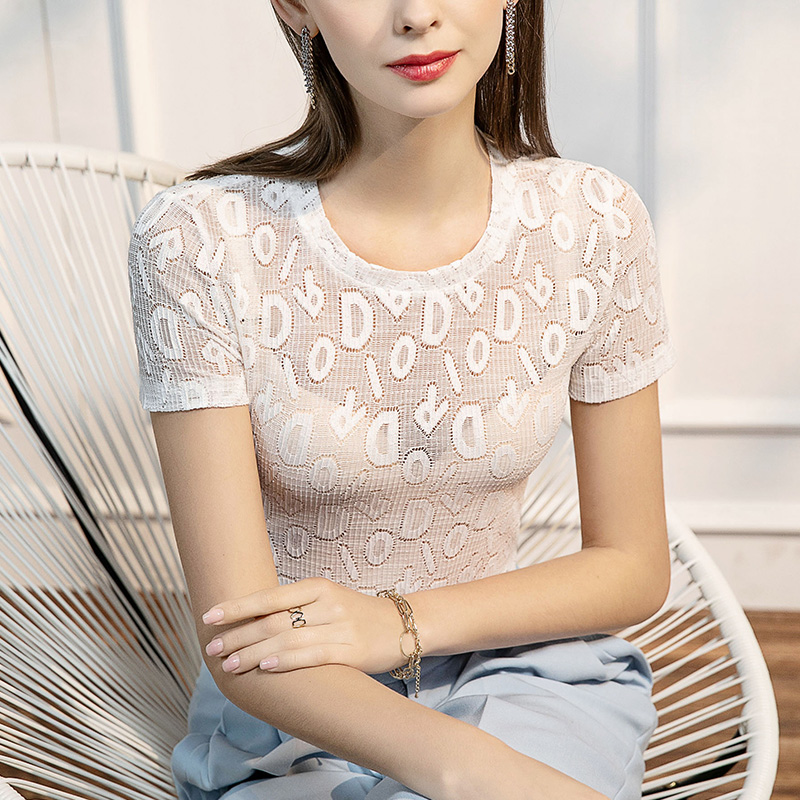 2025夏季新款字母蕾丝打底衫女短袖圆领洋气性感女装上衣韩式T恤