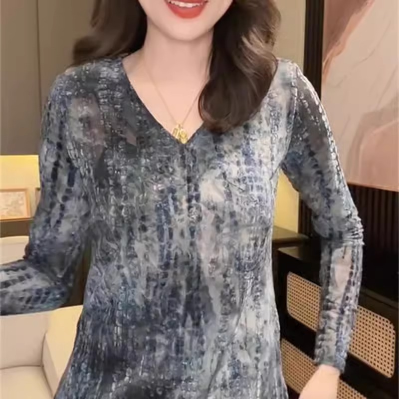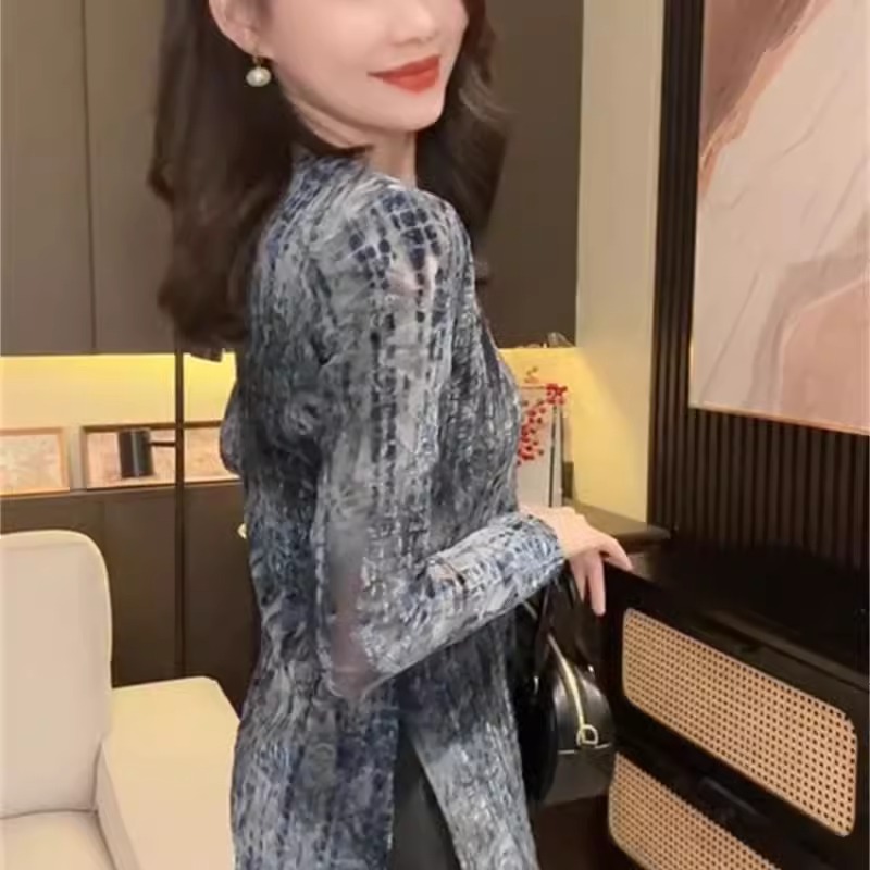 欧货晕染渐变侧开叉中长款T恤衫女春秋新款气质时尚修身显瘦上衣
