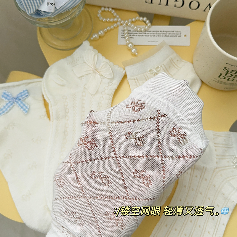 新款白色蝴蝶结袜子女短袜夏季薄款纯棉透气芭蕾风花边短筒袜船袜