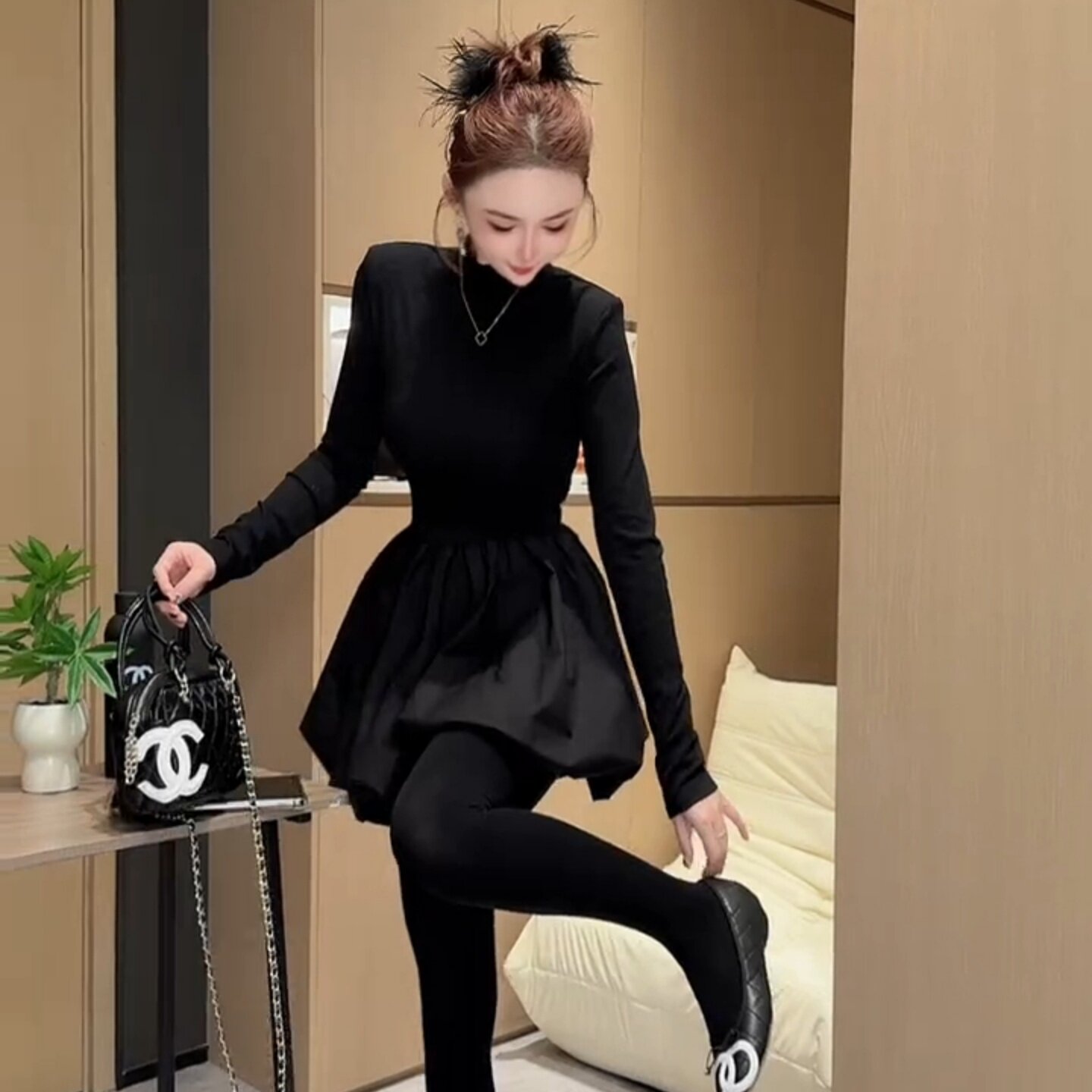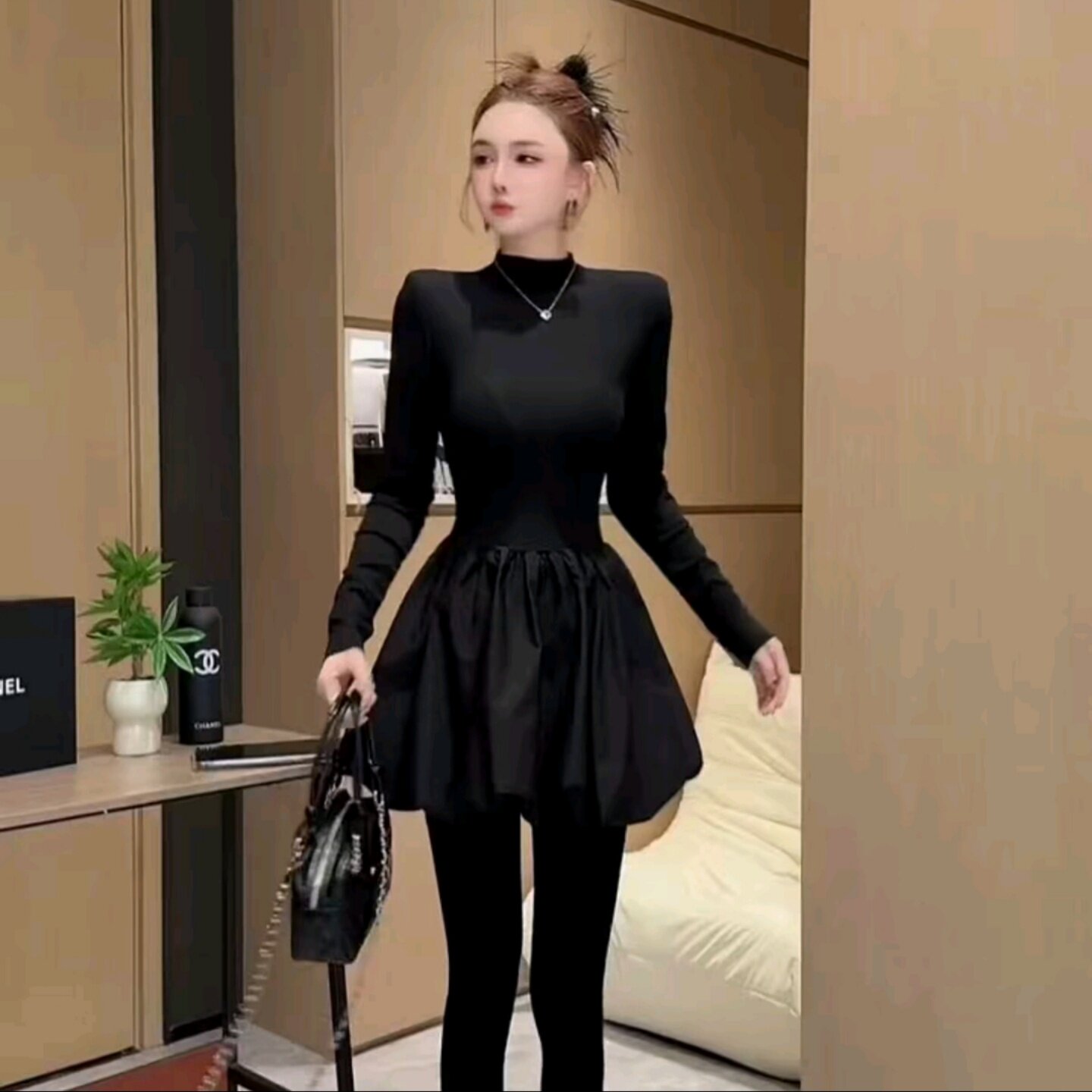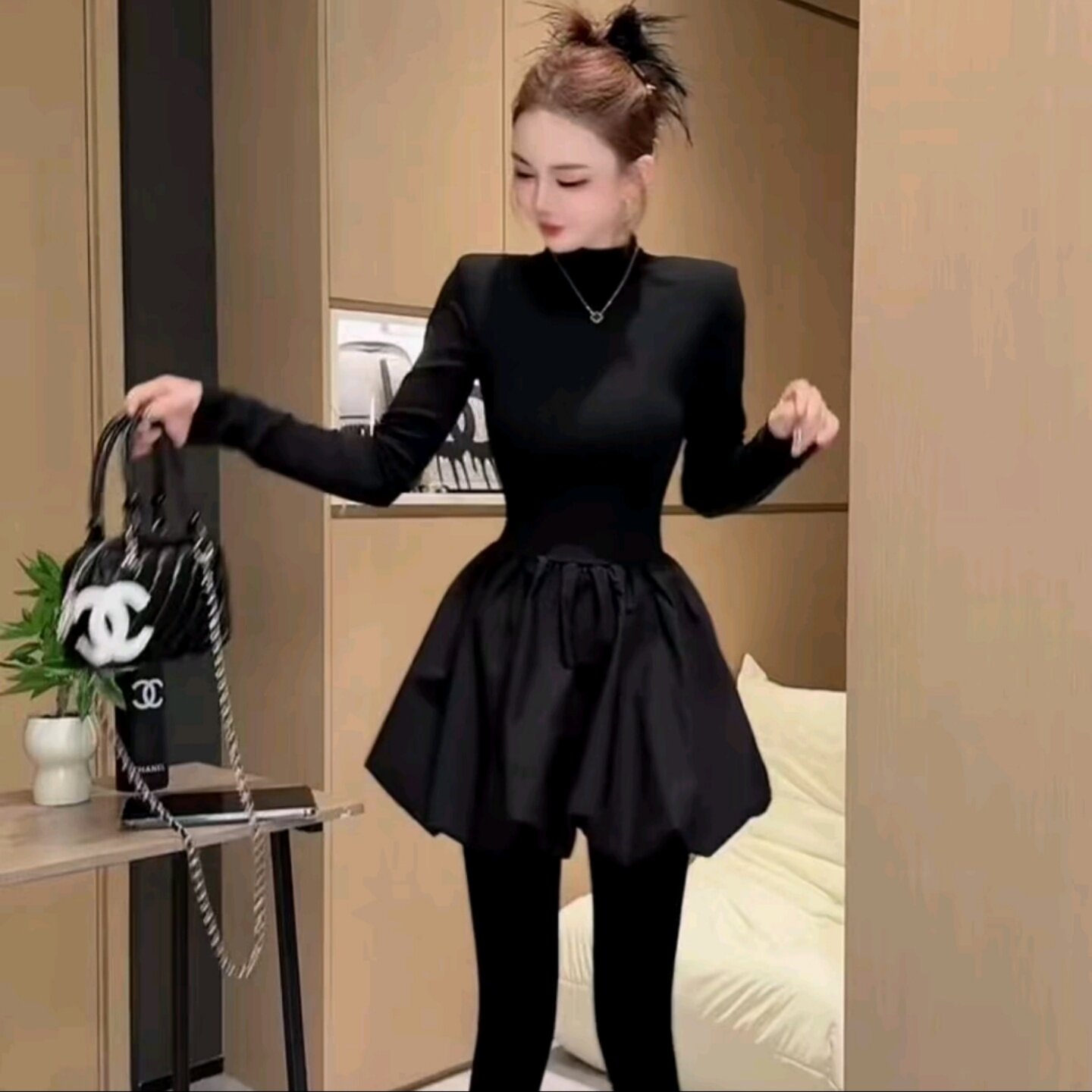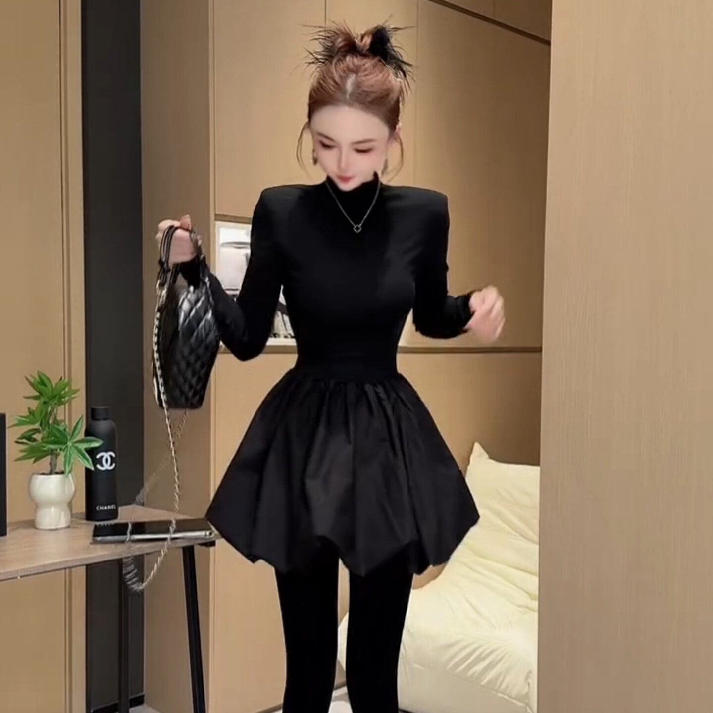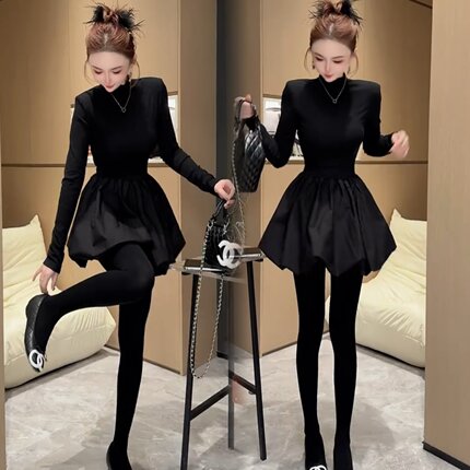 2025秋半高领气质款减龄显瘦长袖收腰时尚黑天鹅洋气蓬蓬裙连衣裙