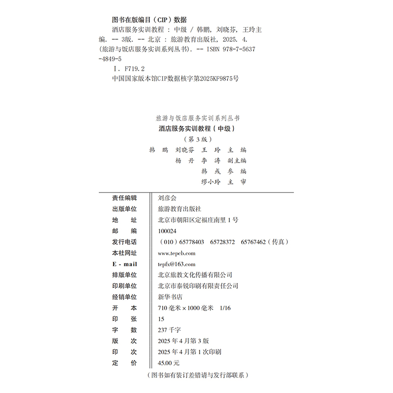 酒店服务实训教程 中级 第3版 韩鹏 刘晓芬主编 9787563748495新编高职高专旅游管理类专业教材 旅游教育出版社