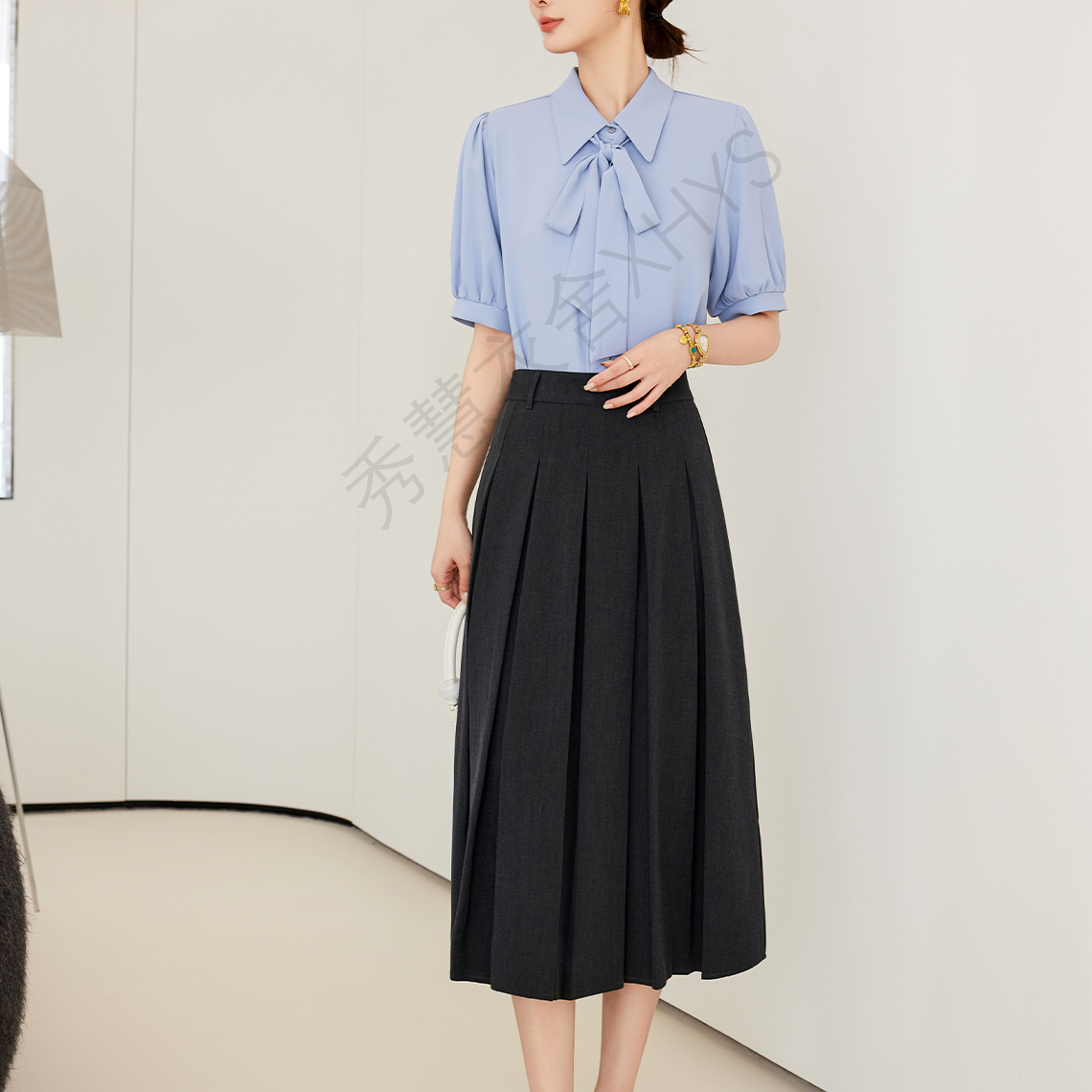 蓝色衬衫女蝴蝶结飘带雪纺夏季新款面试短袖衬衣百褶西装半身裙子