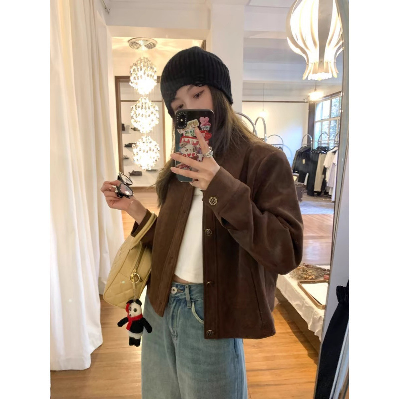咖色鹿皮绒外套女短款2025春秋韩系宽松休闲复古小个子夹克上衣