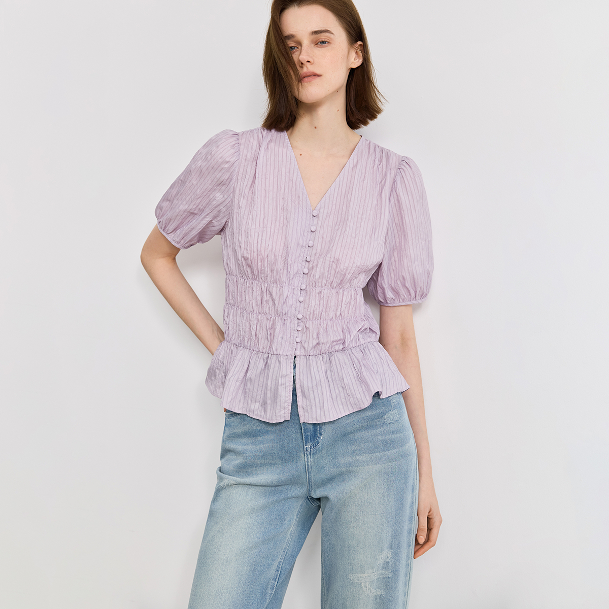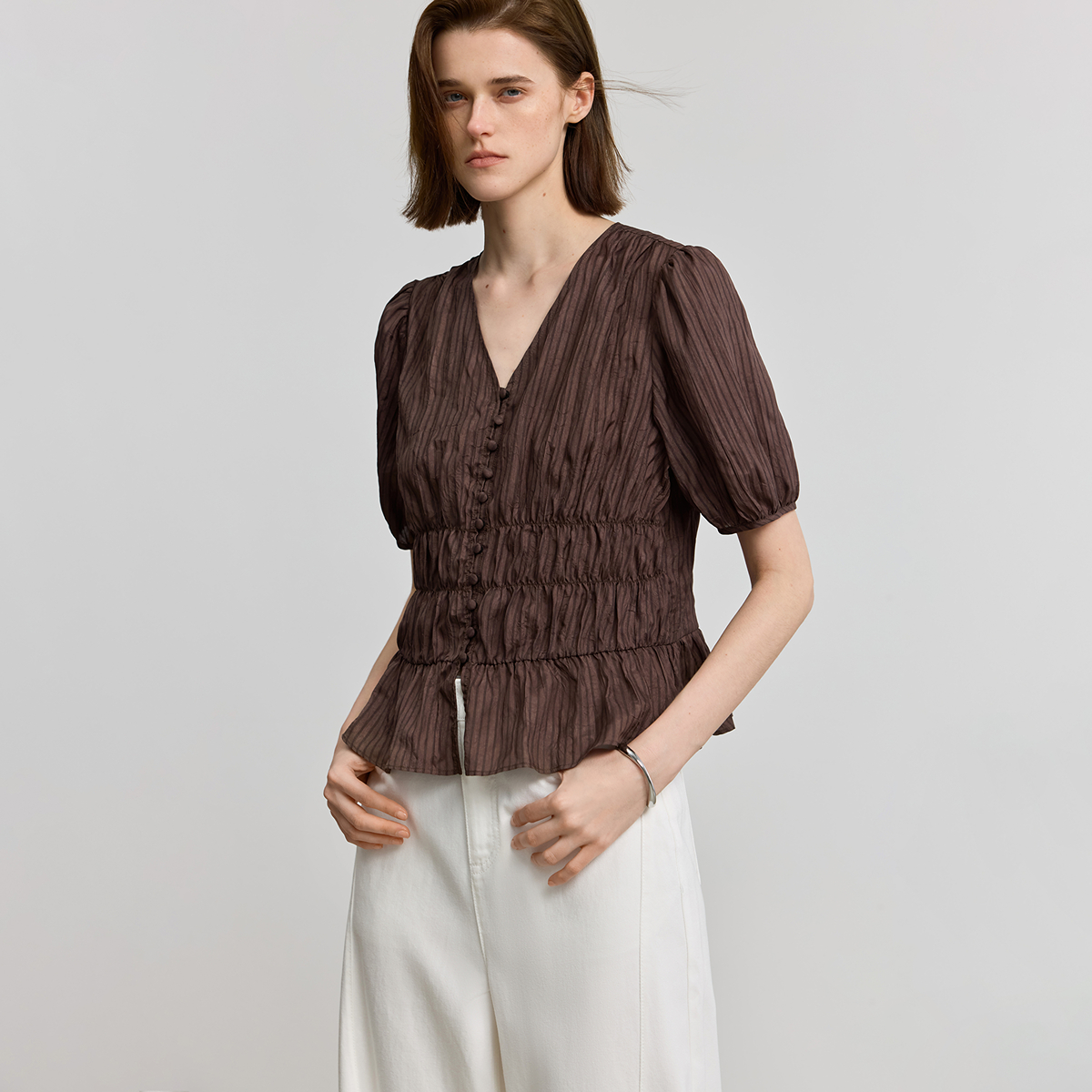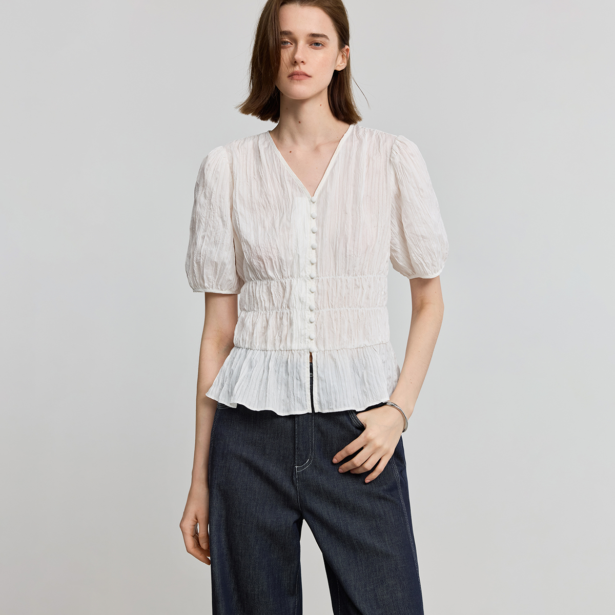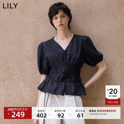 LILY2025夏新款女装法式浪漫V领收腰休闲百搭通勤泡泡袖短袖衬衫