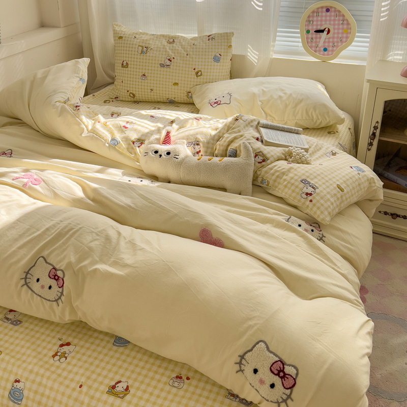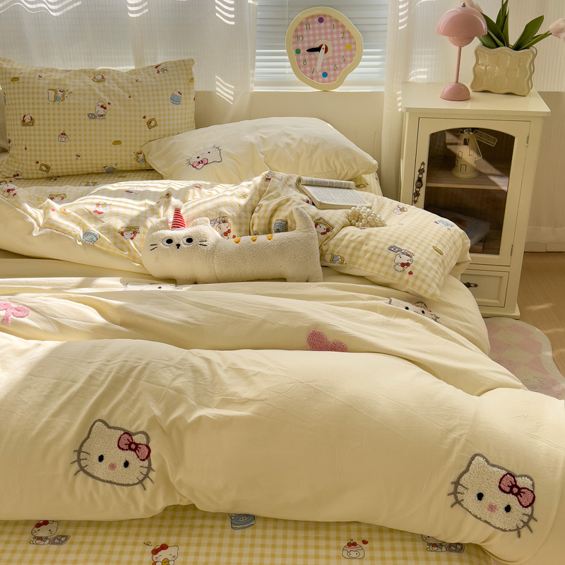 ins超柔少女心黄色KT猫毛巾绣水洗棉四件套非纯棉宿舍床单三件套4