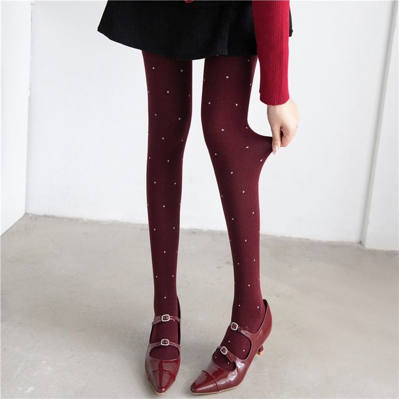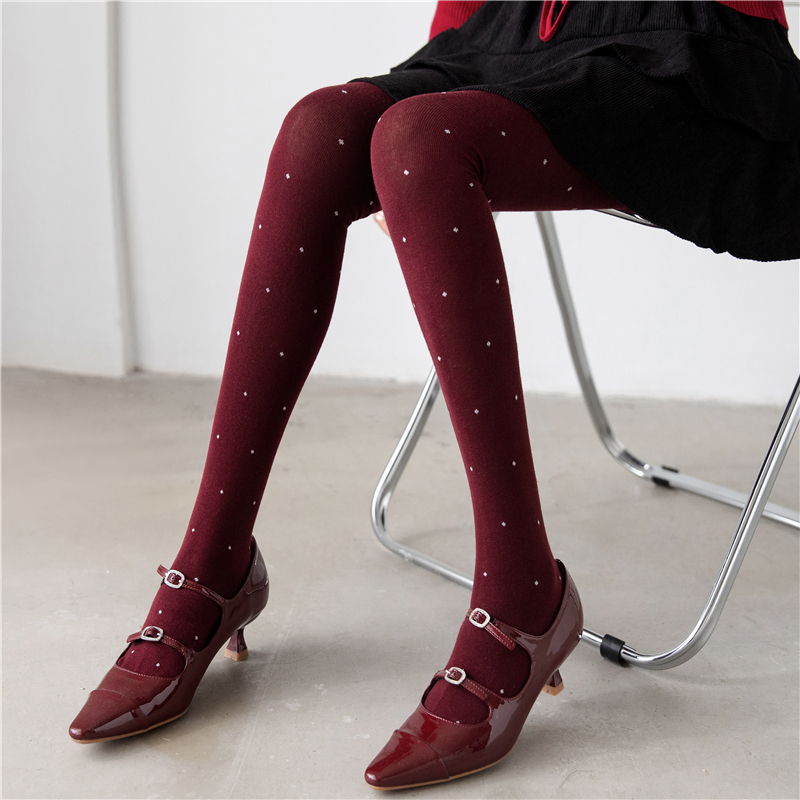秋冬酒红色丝袜复古波点连裤袜子miu系加厚白丝袜安可拉红打底裤