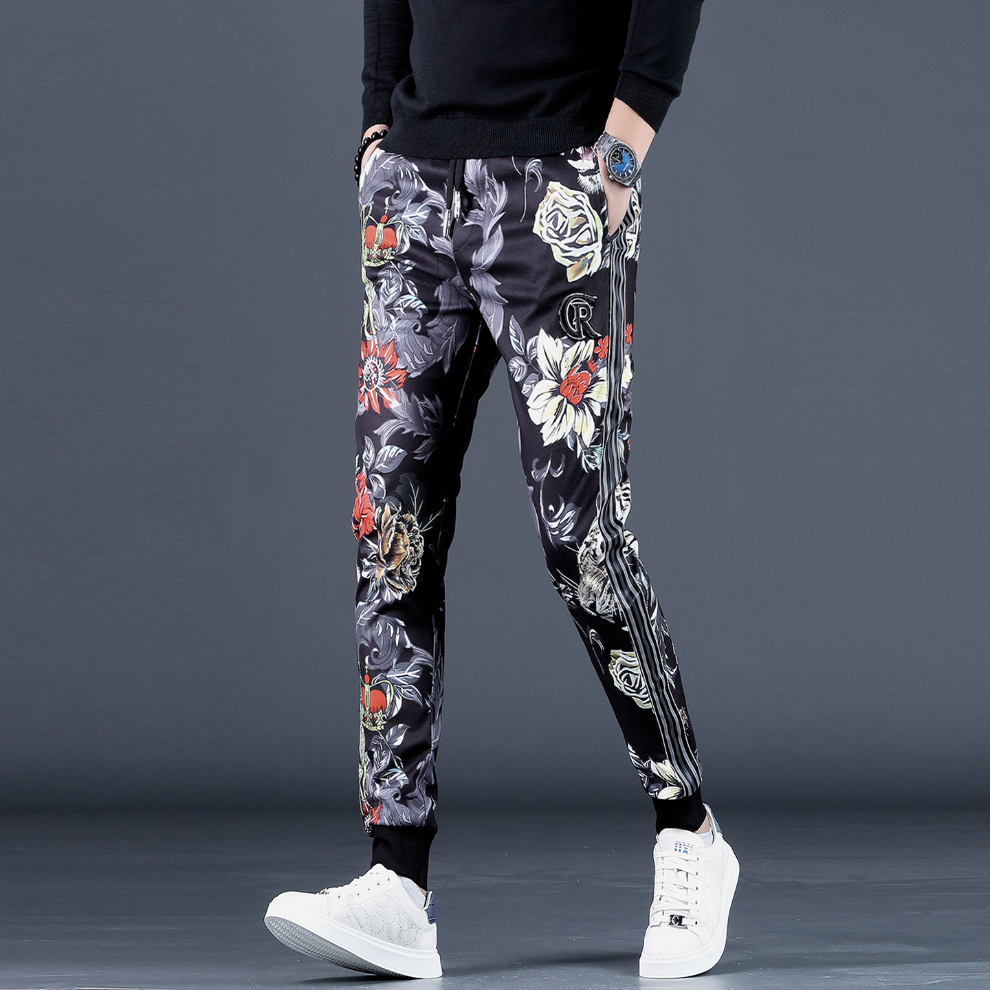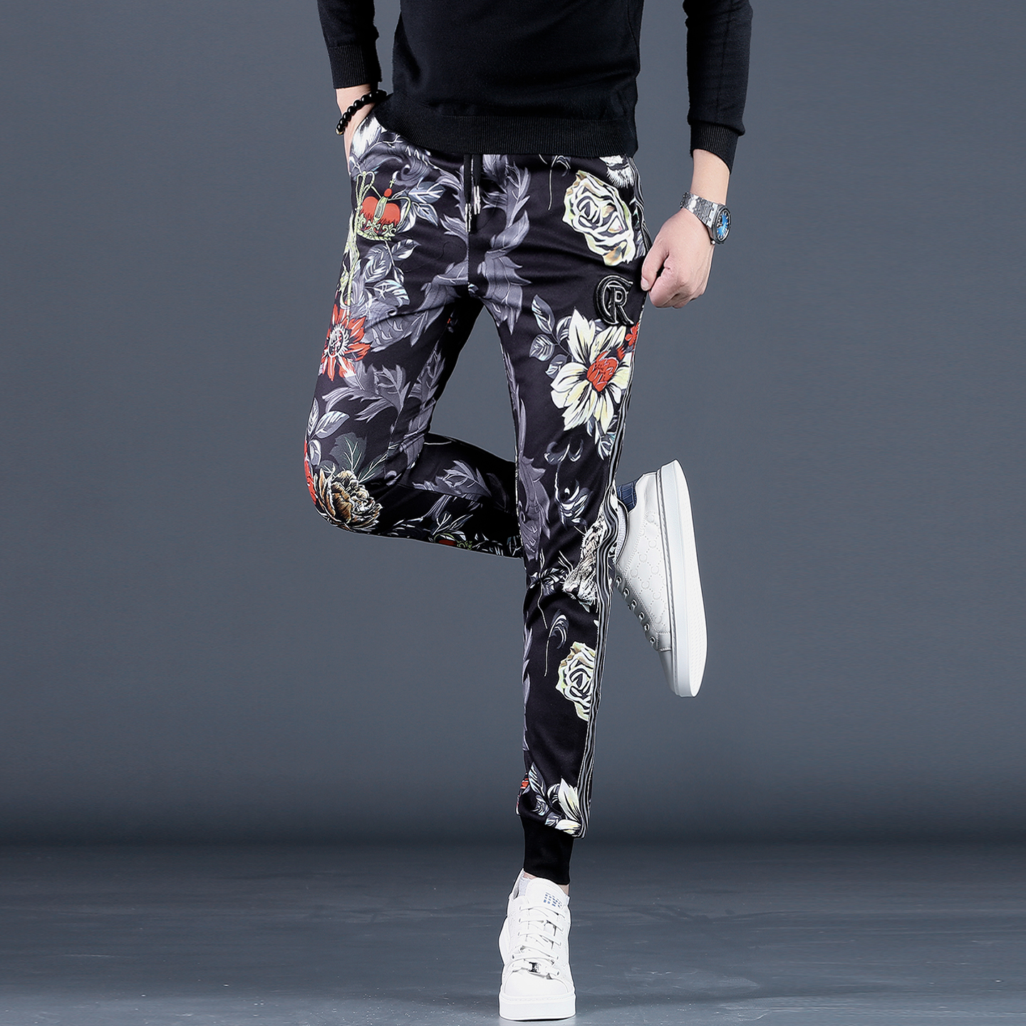 高级感男士休闲裤时尚修身小脚长裤子男款潮流帅气大满花运动卫裤