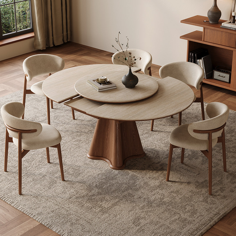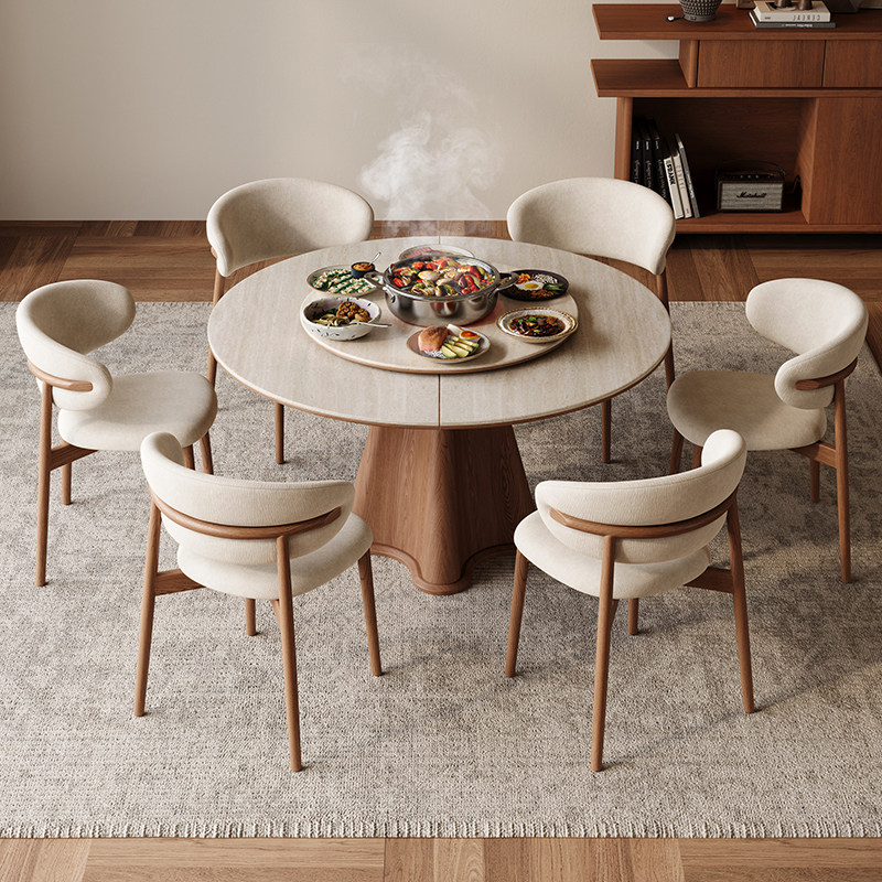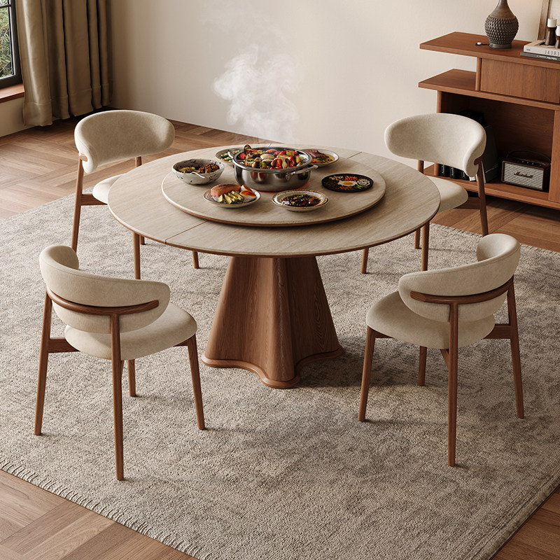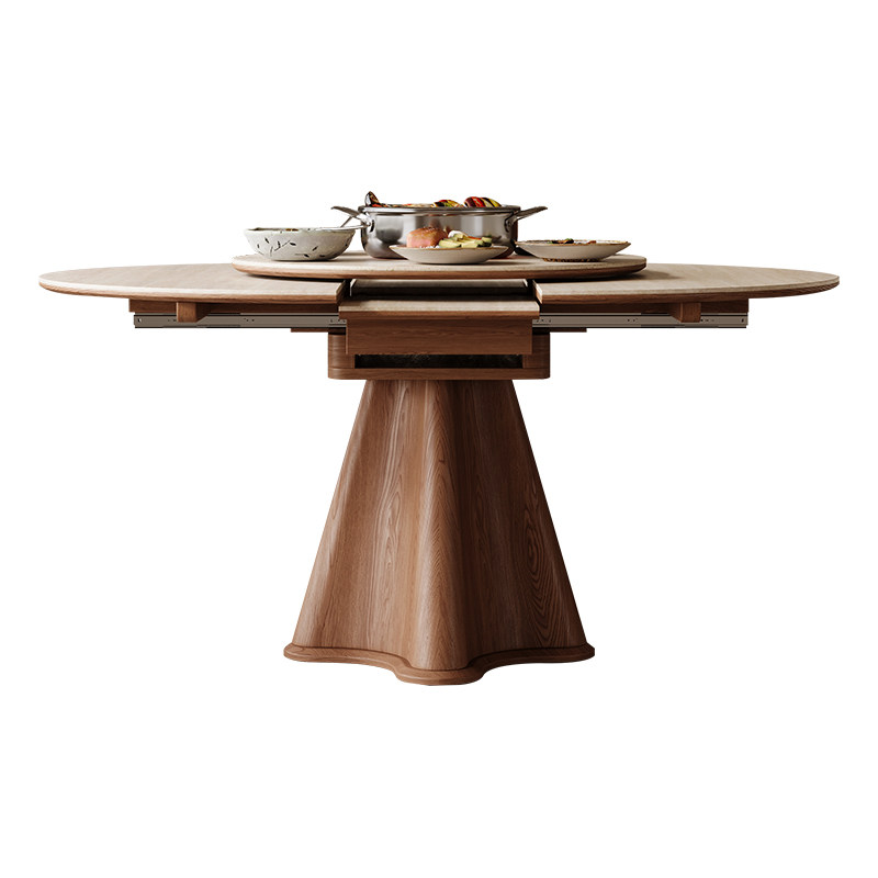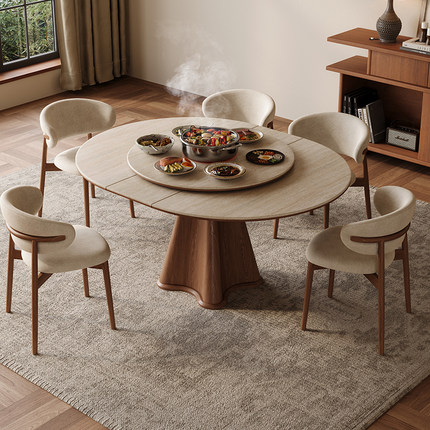 中古风洞石岩板伸缩餐桌带电磁炉圆桌拉伸小户型实木功能饭桌子