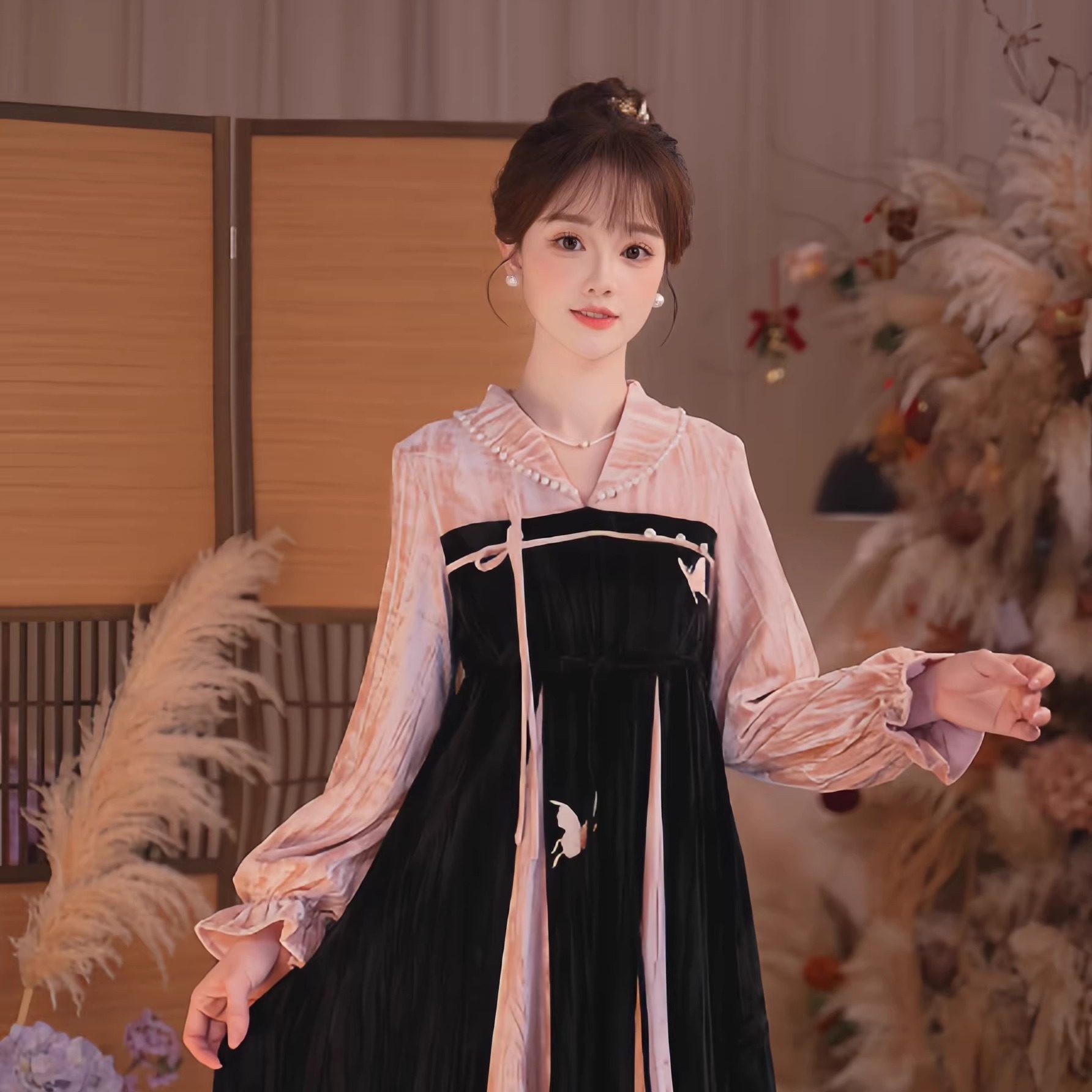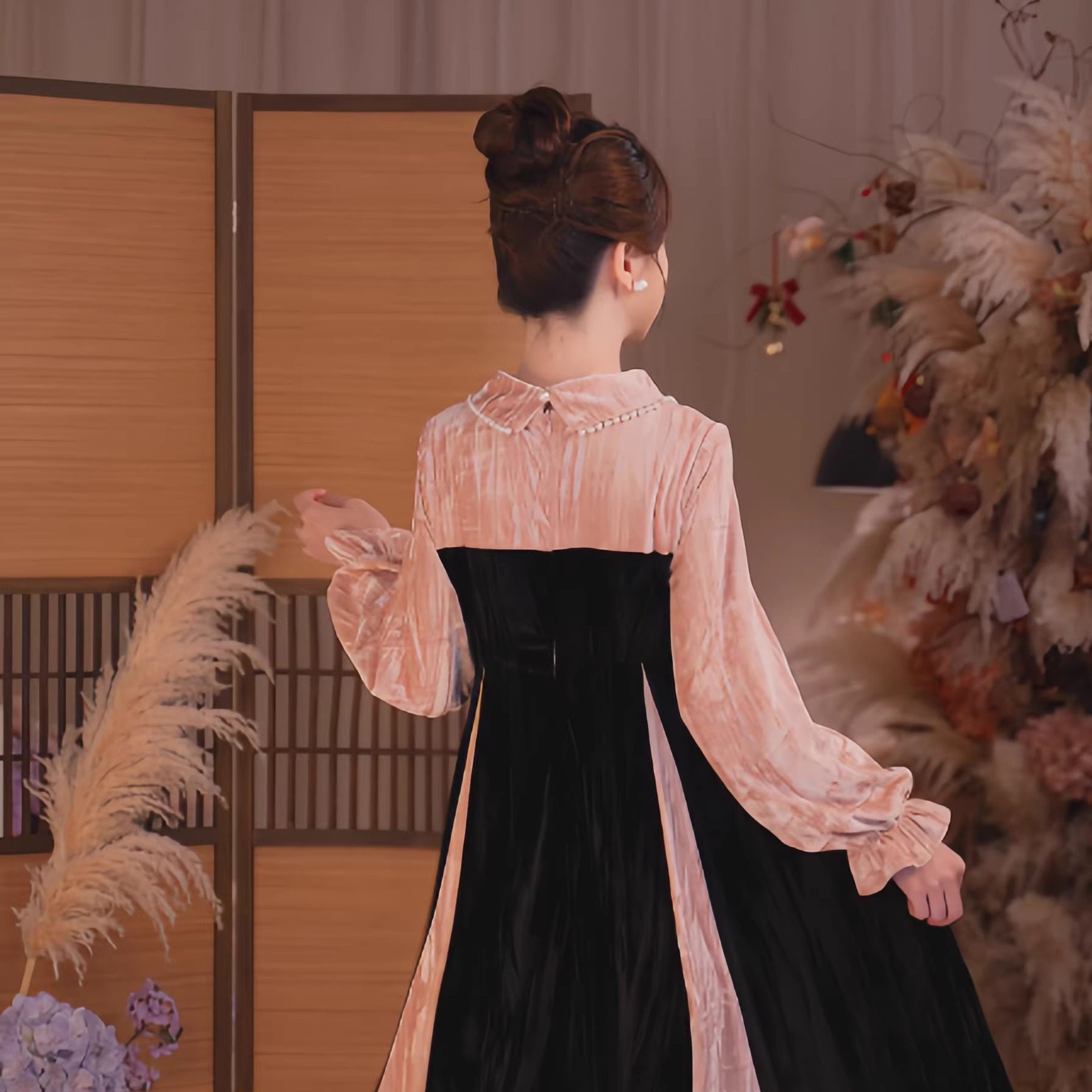 瑶西粉黑暮色厚丝绒改良汉服裙