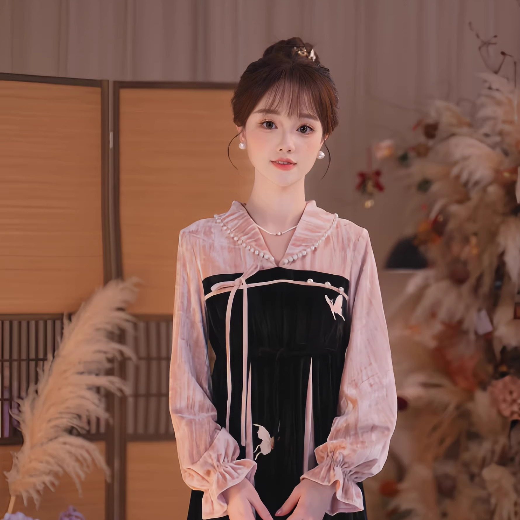 瑶西【粉黑暮色】冬季新款刺绣高级粉黑厚丝绒款改良汉元素连衣裙