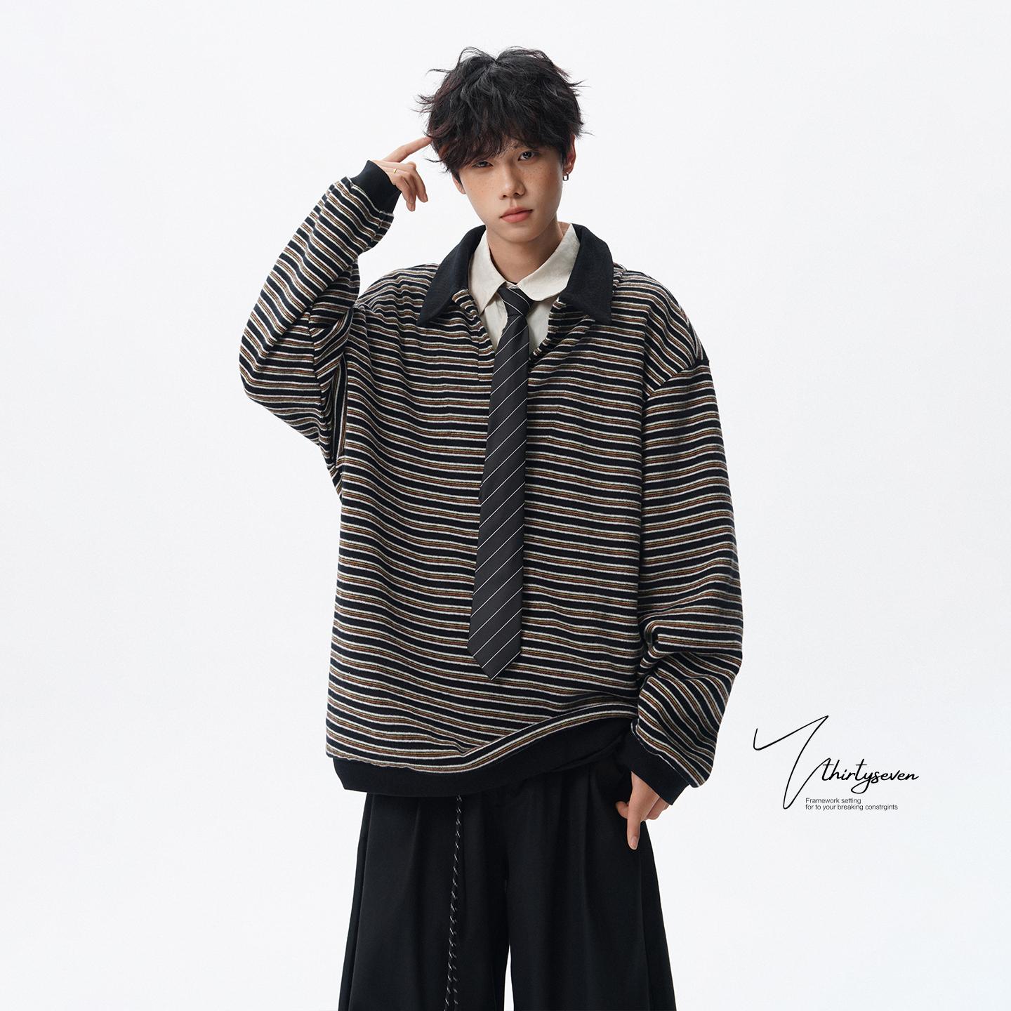V37假两件条纹翻领polo衫卫衣男秋美式复古宽松情侣休闲外套上衣