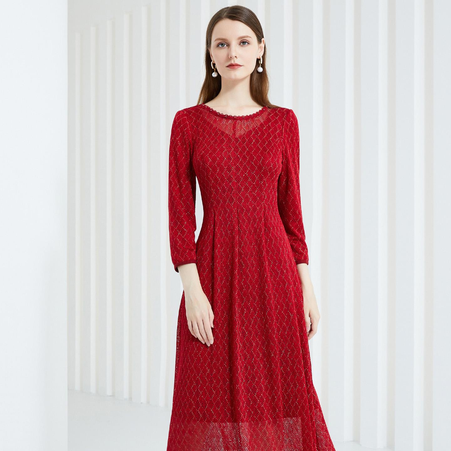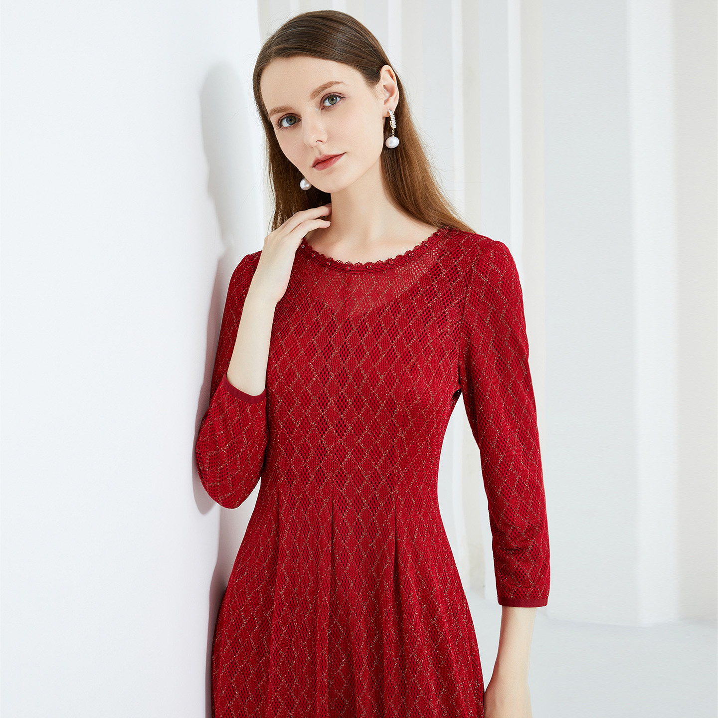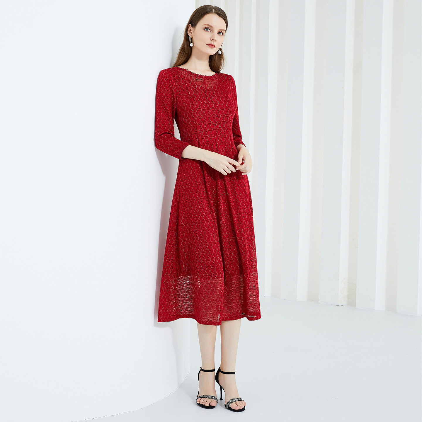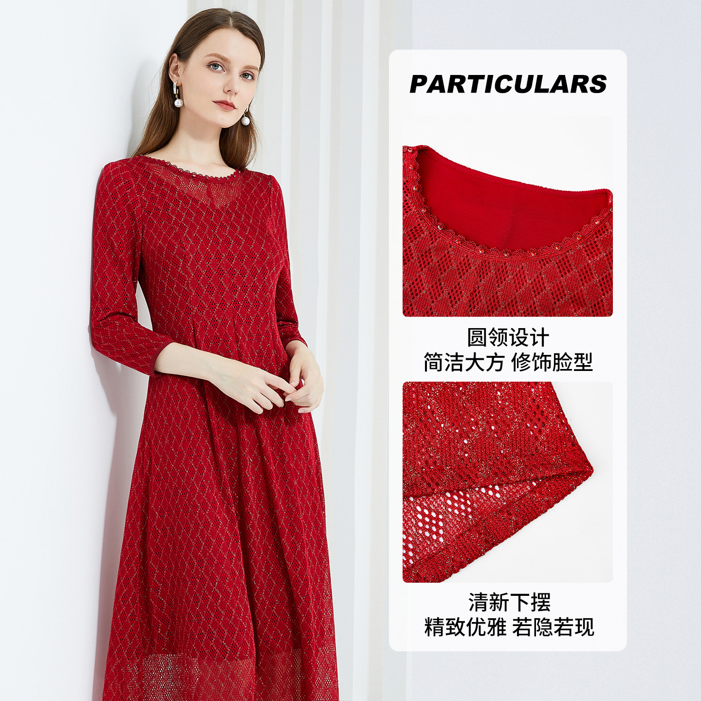 马天奴2025秋冬新款红色蕾丝网孔钉珠圆领连衣裙子收腰长袖气质女