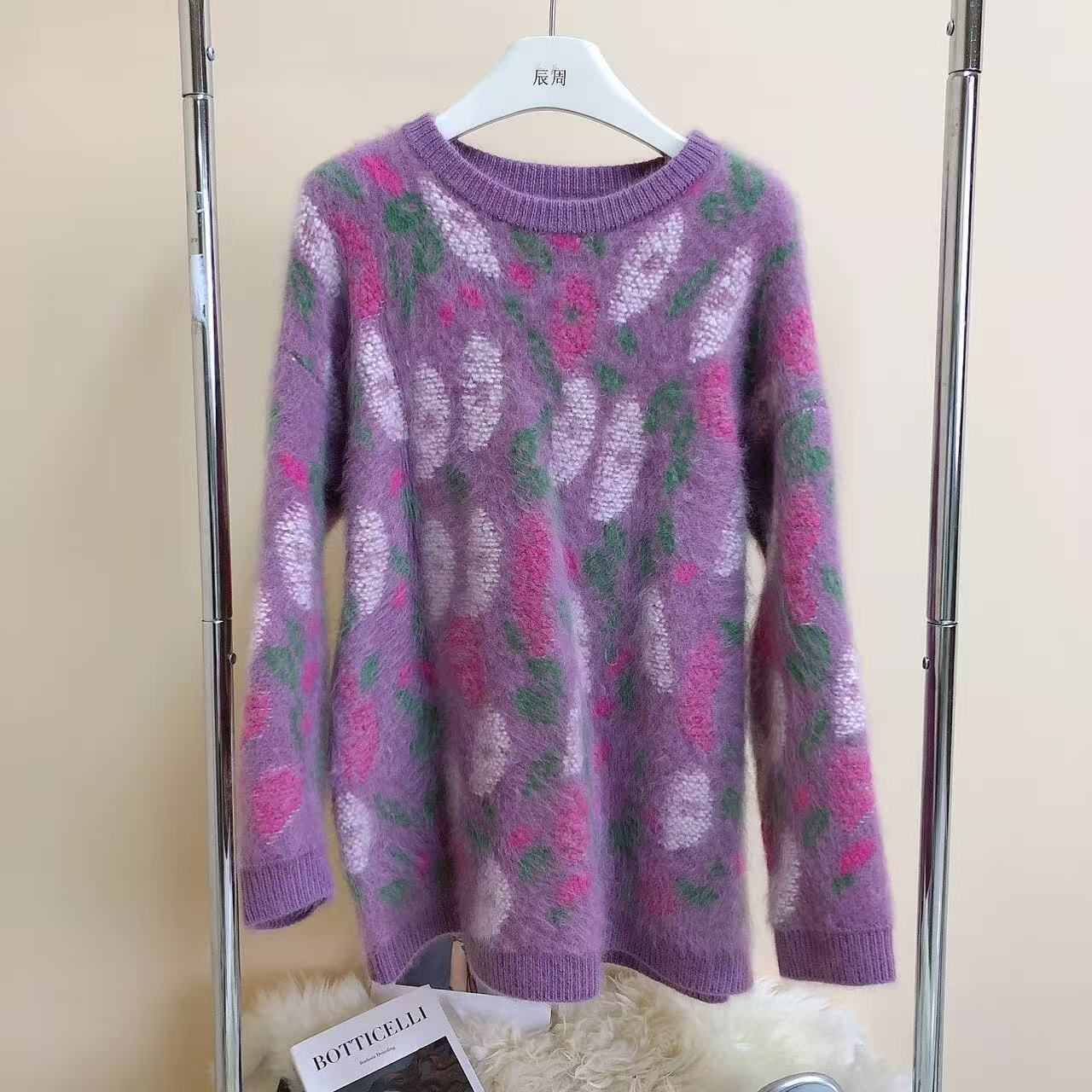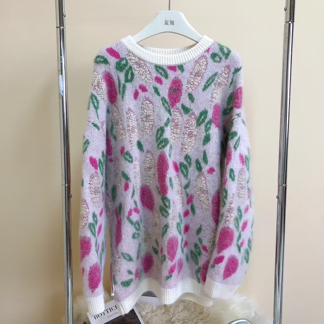 【羊绒拉绒】女士针织毛巾绣工艺圆领套头长袖打底衫8.27衣长70