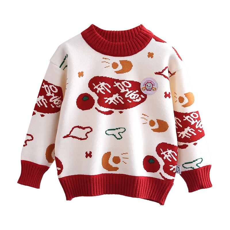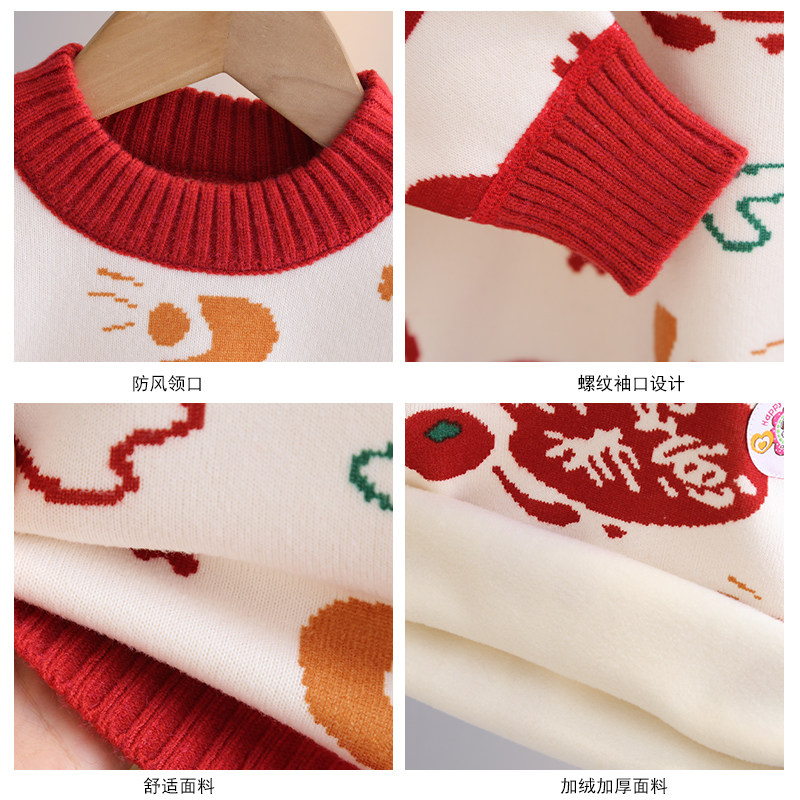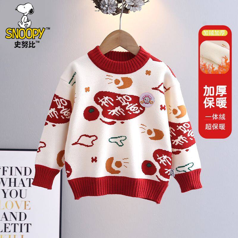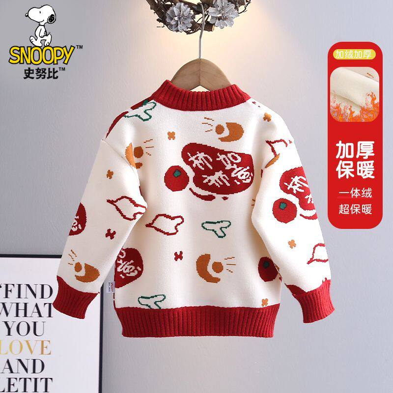 史努比女童毛衣2025新款秋冬迎春喜庆百搭上衣男孩加绒加厚拜年服