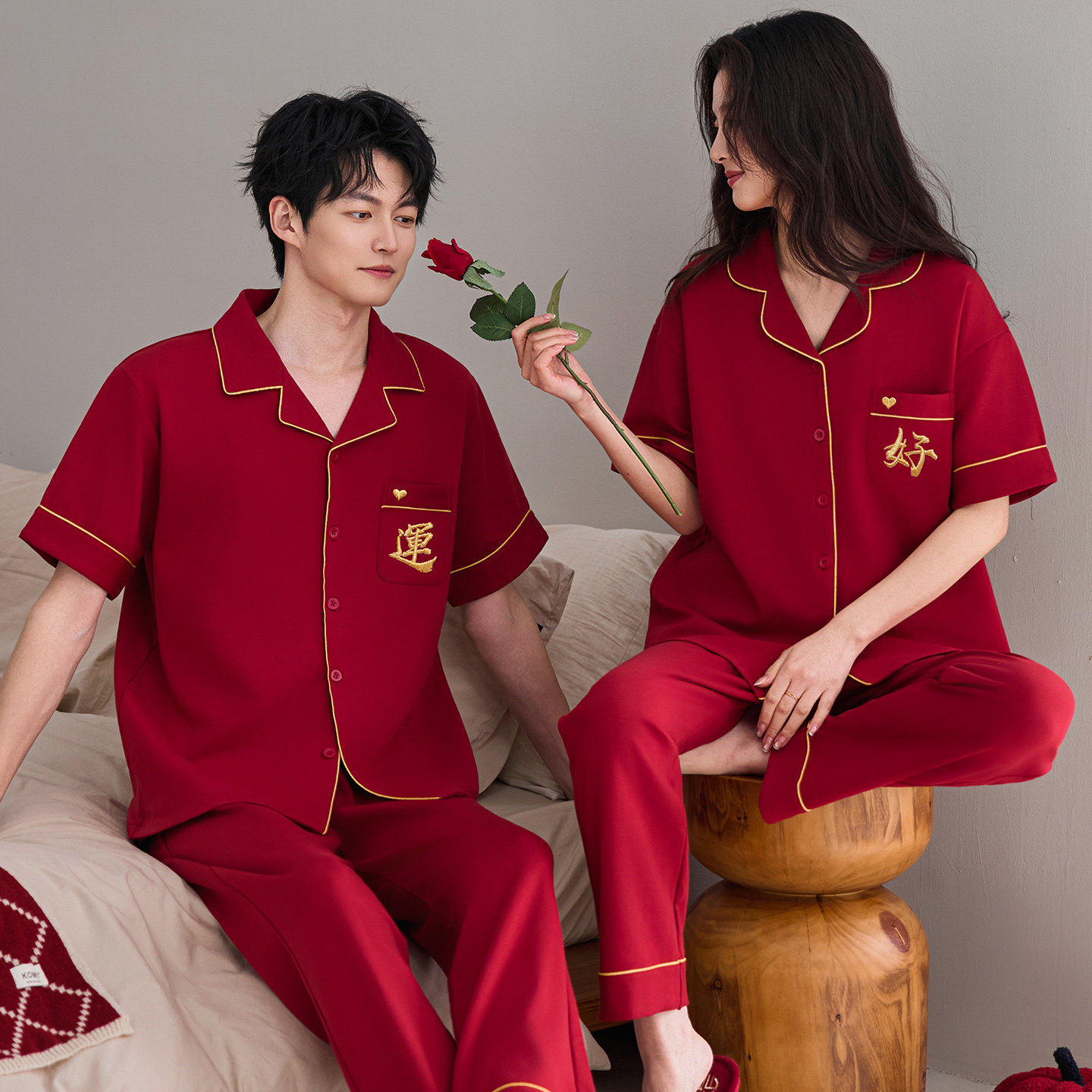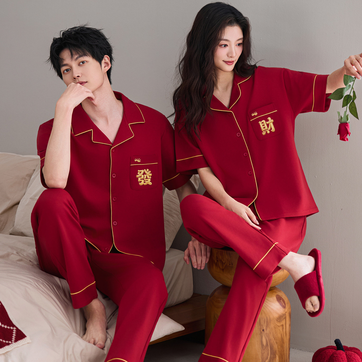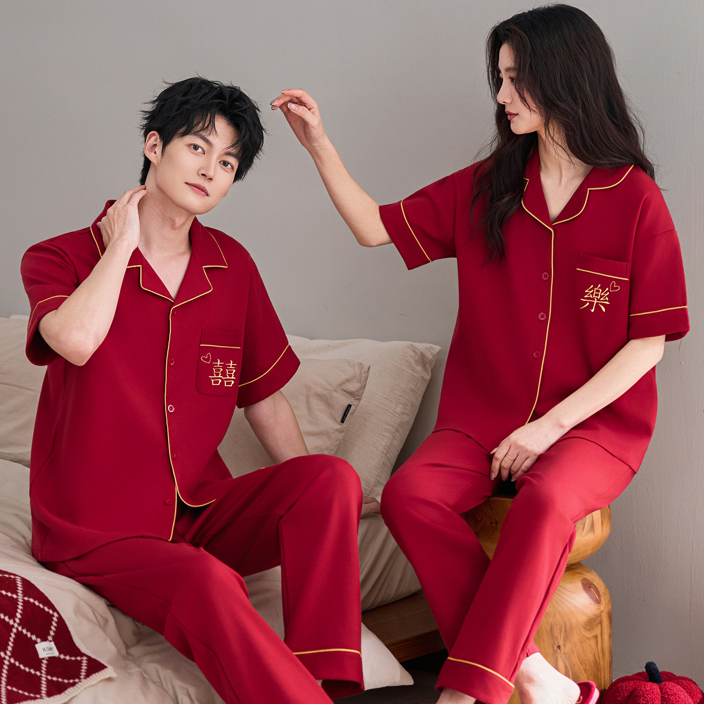 情侣睡衣夏季纯棉结婚短袖长裤男女款红色特大码240斤300斤6XL7XL