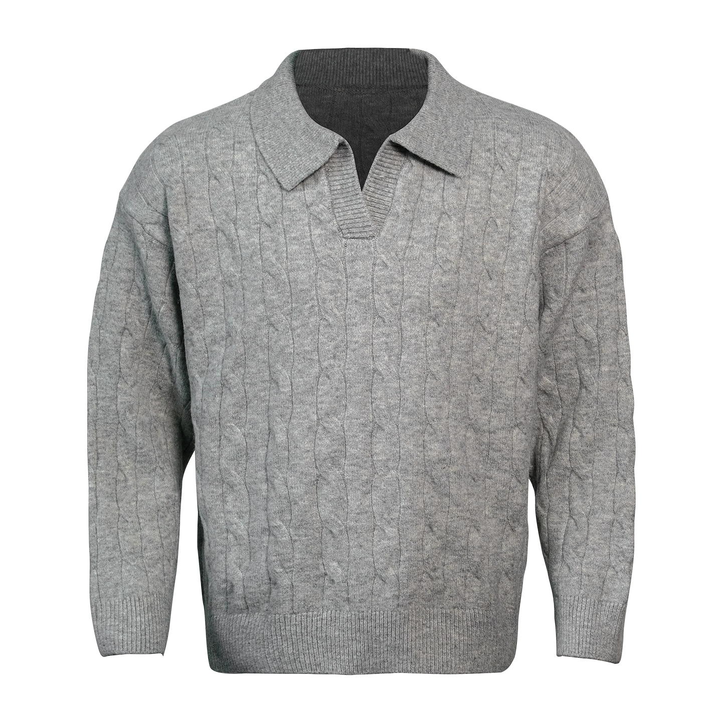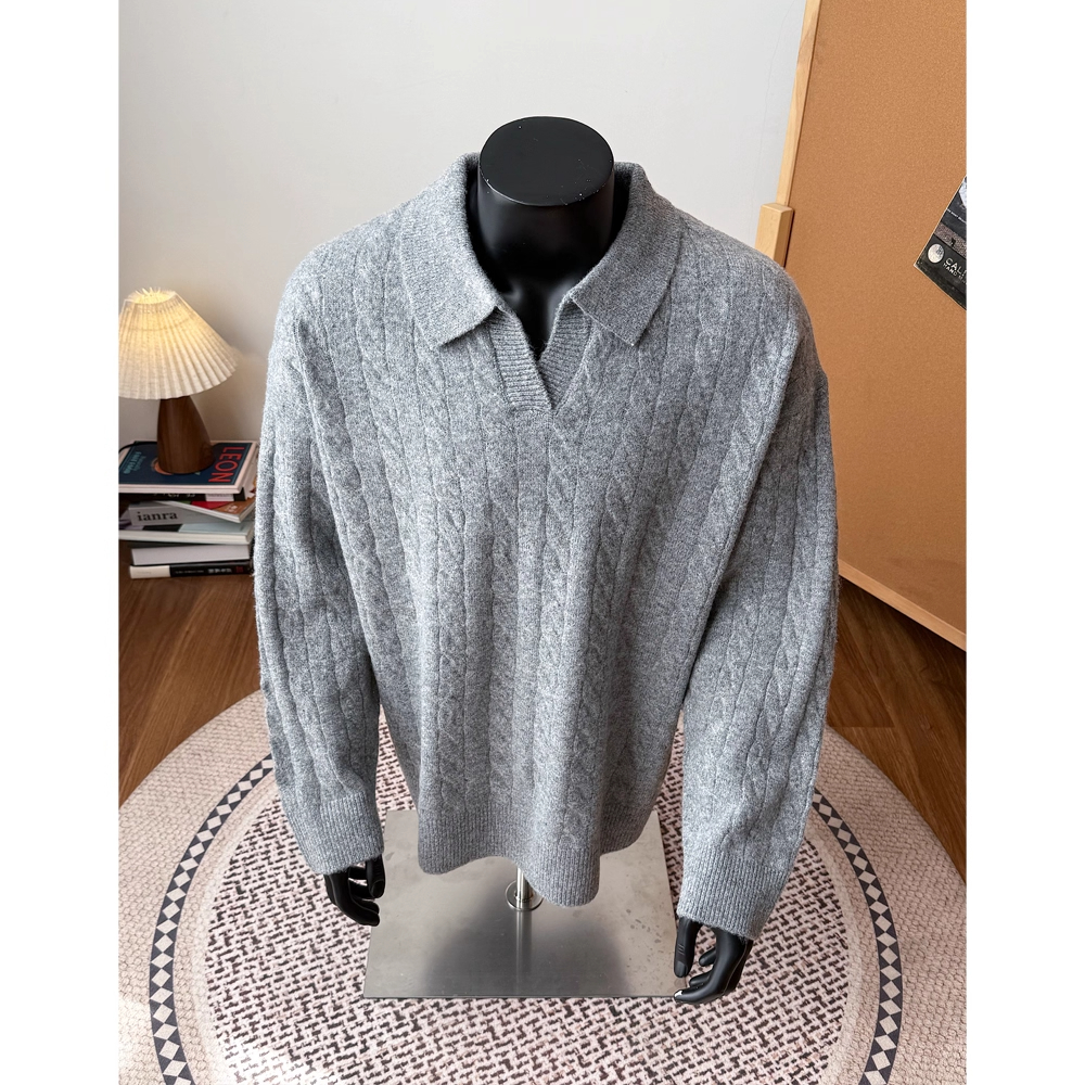 春秋复古风翻领假两件绞花纹毛衣男宽松百搭休闲纯色男女针织衫