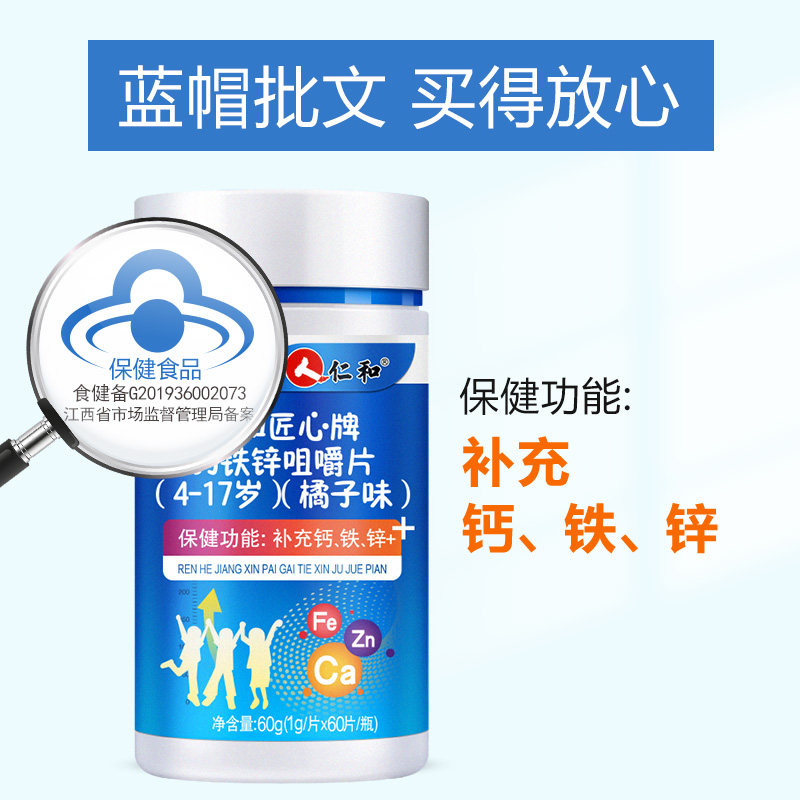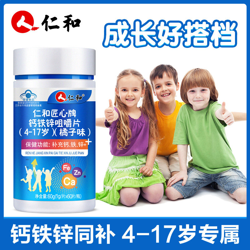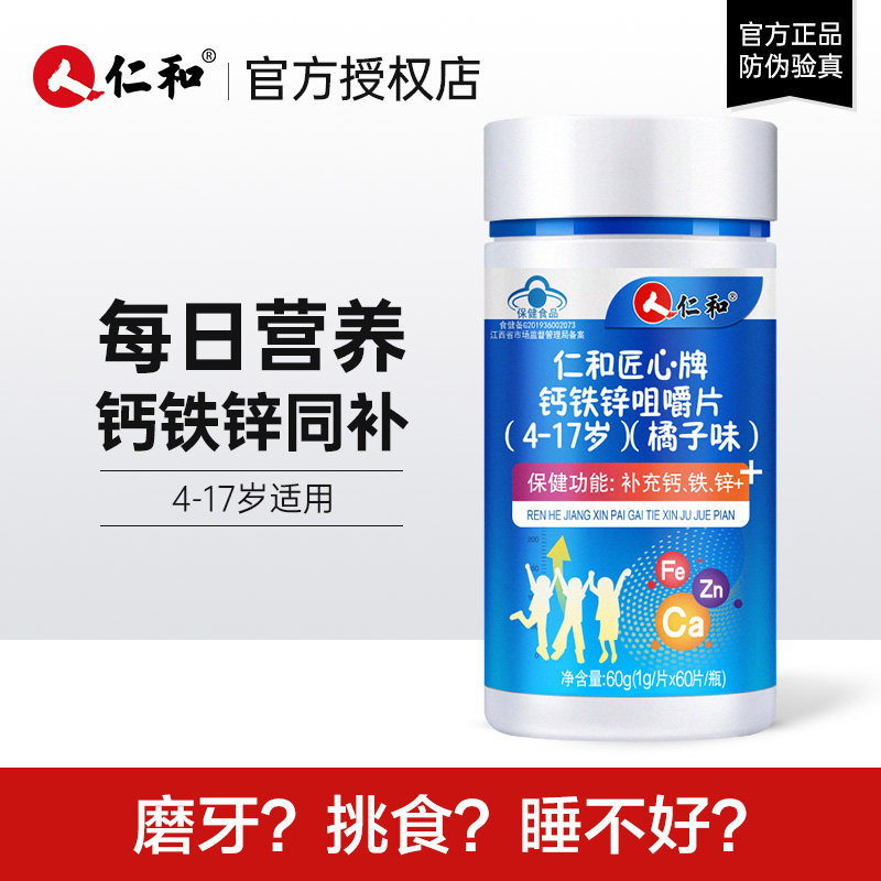 仁和钙铁锌咀嚼片60粒/瓶儿童口服青少年学生非增提钙片补钙