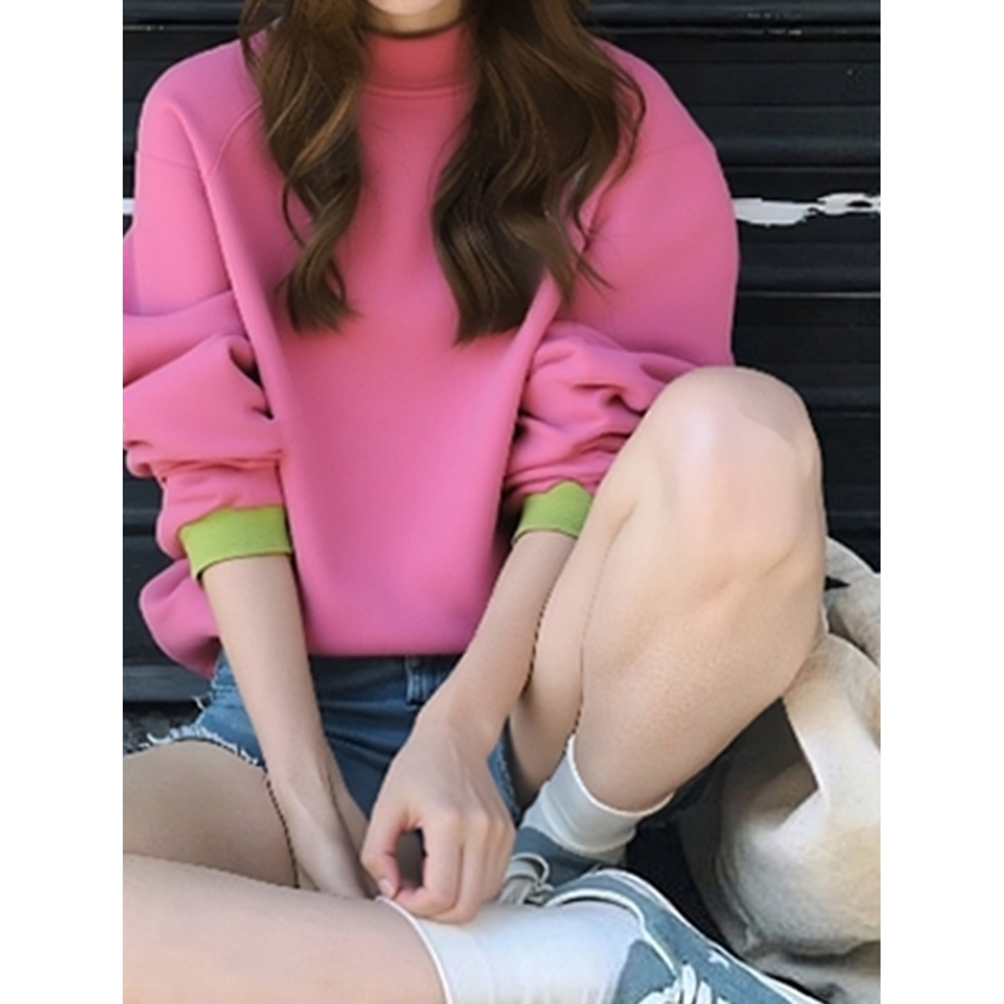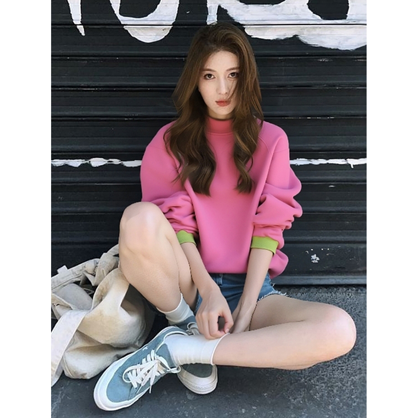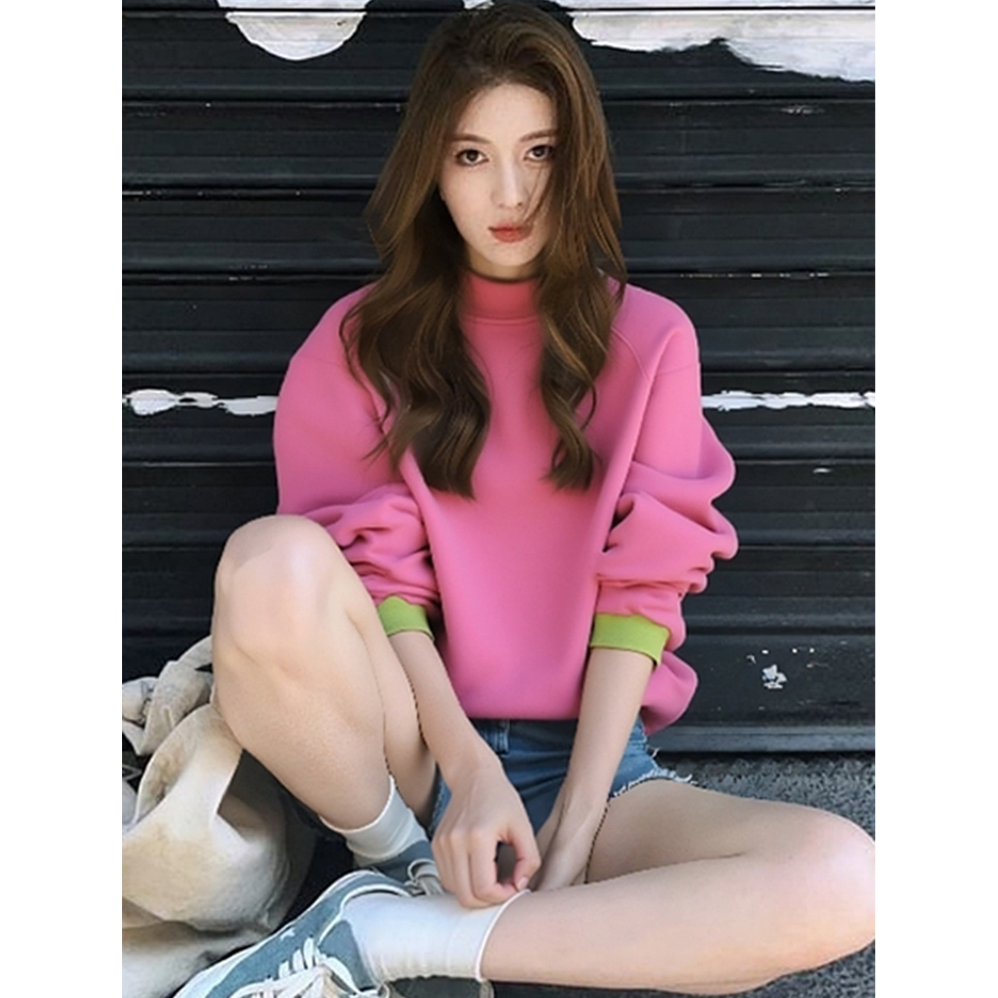 早秋新款小个子韩系百搭上衣美式复古慵懒chic多巴胺粉色圆领卫衣