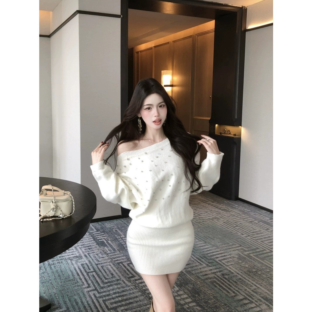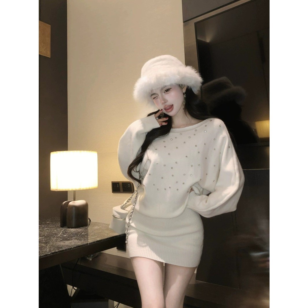 小香风烫钻针织连衣裙女秋冬纯欲性感一字肩包臀裙蝙蝠袖毛衣裙子
