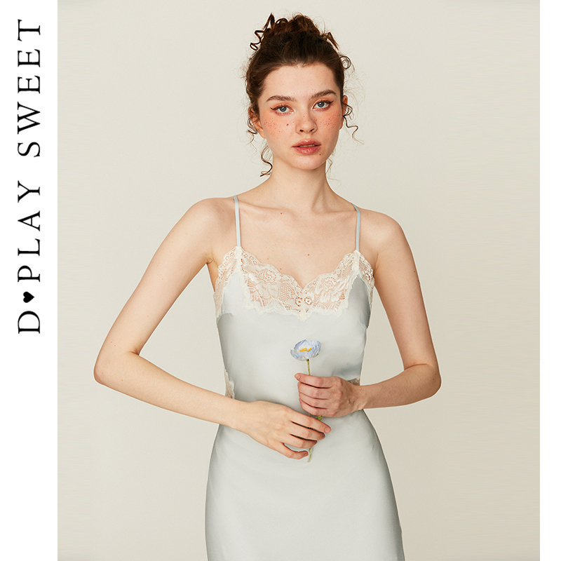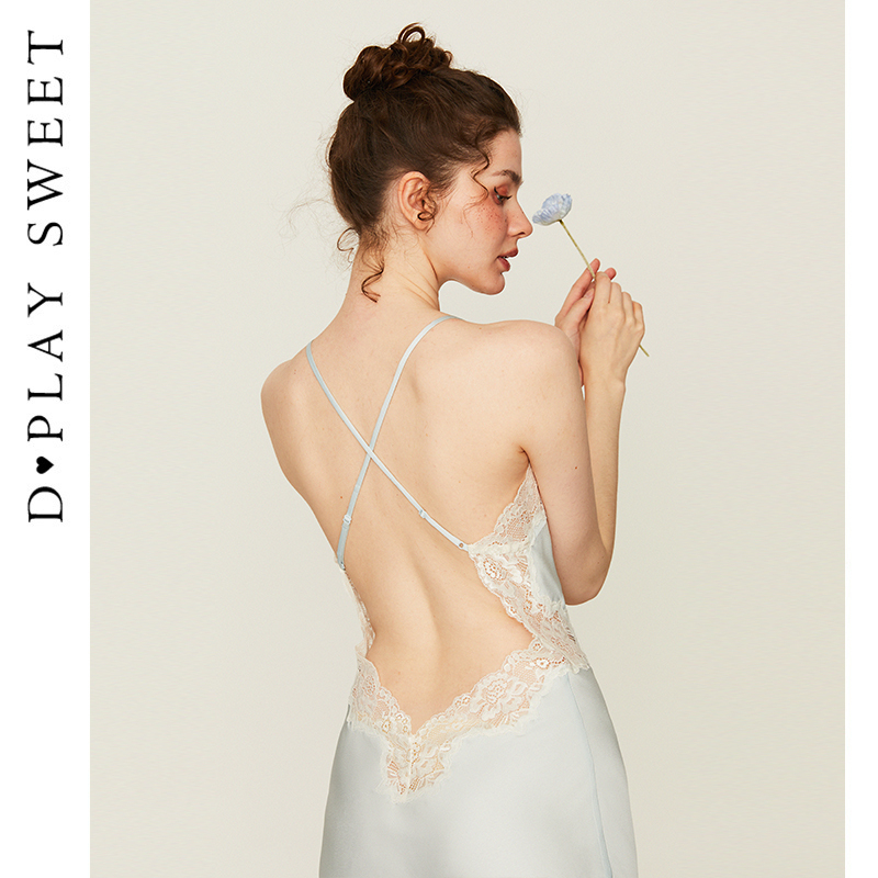 DPLAYSWEET法式性感蓝色蕾丝美背吊带裙睡裙女复古缎面睡衣家居服