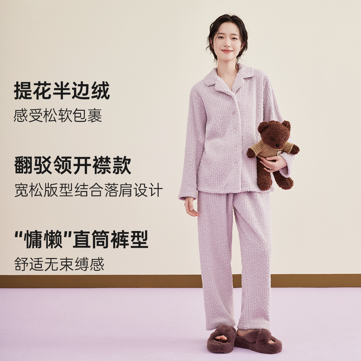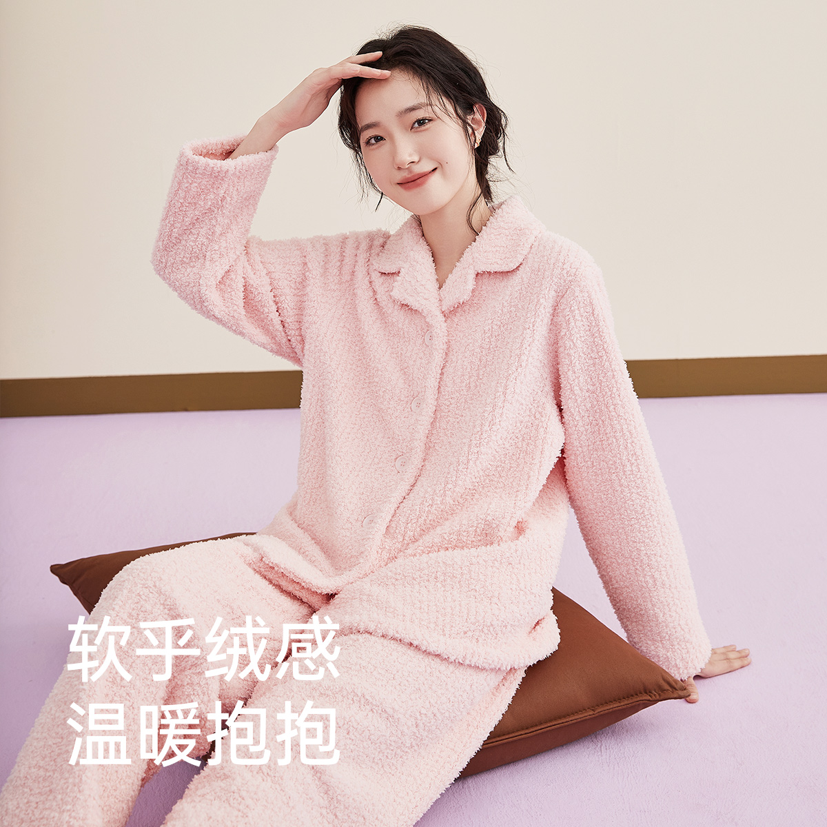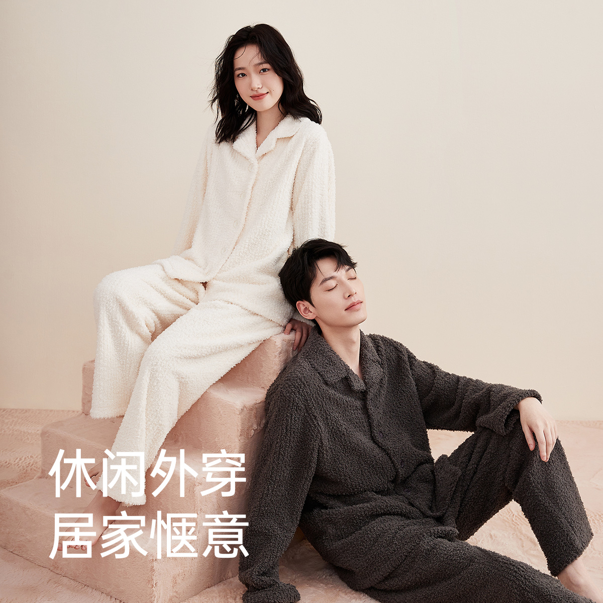 顶瓜瓜珊瑚绒情侣睡衣女秋冬加厚半边绒抗静电可外穿家居服套装男
