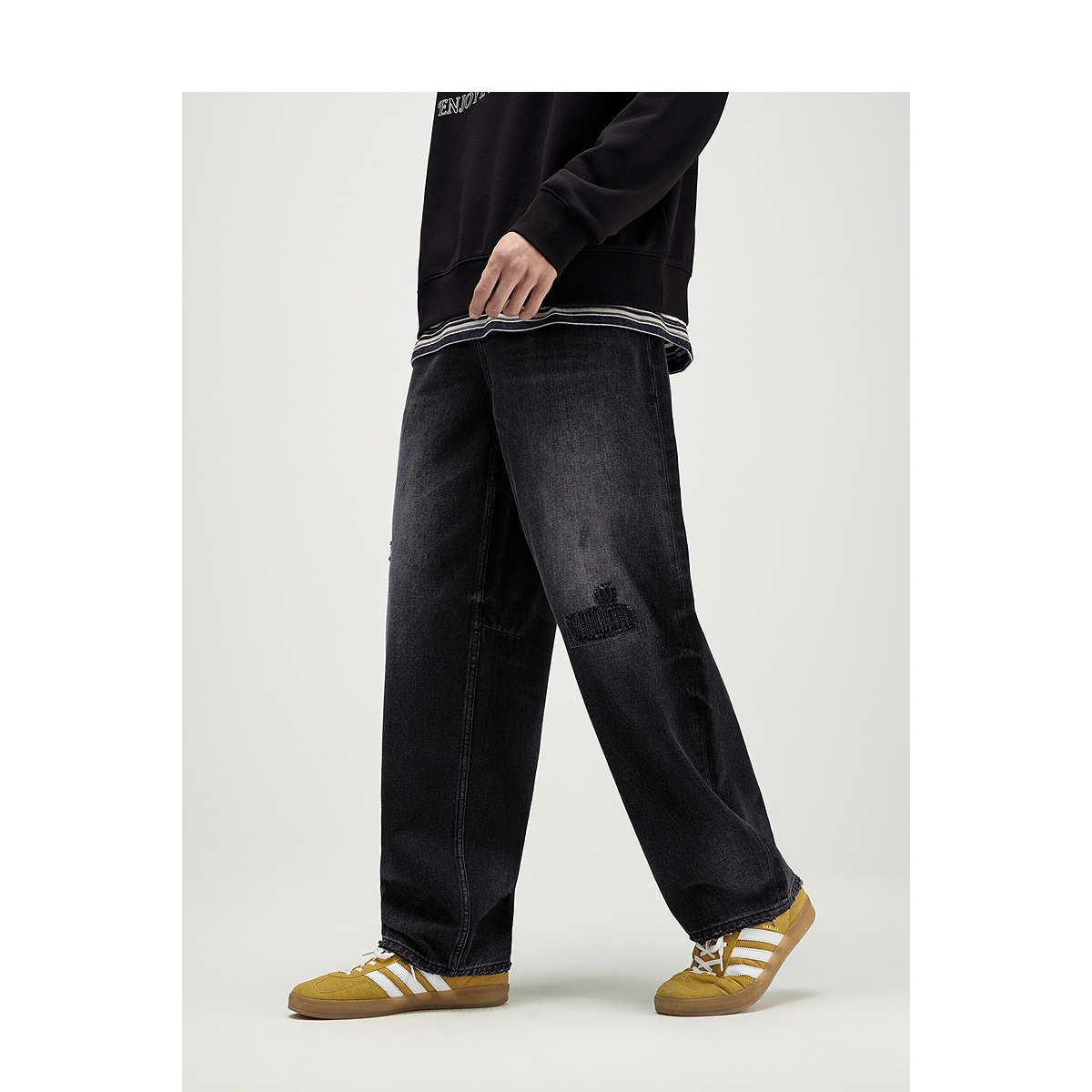 太平鸟男装牛仔裤24秋季新款黑色水洗全棉牛仔磨破直筒阔版休闲裤