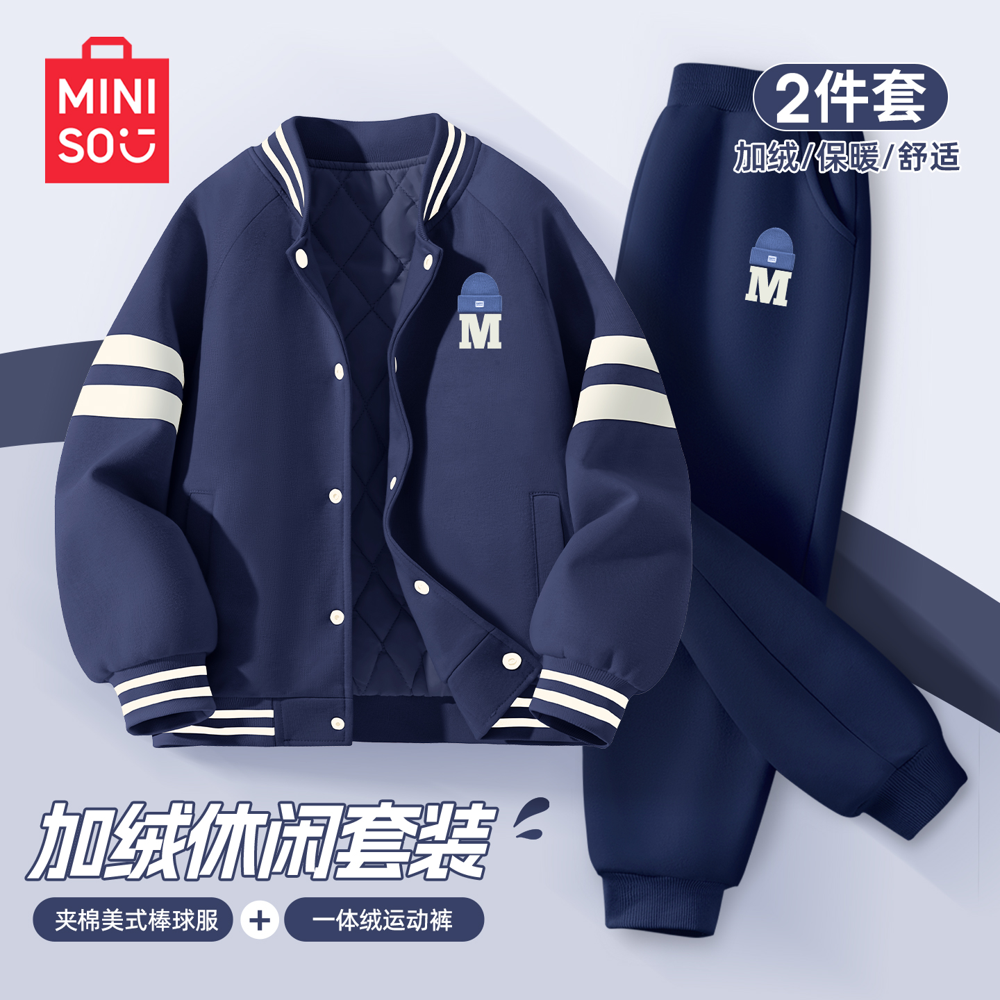 名创优品男童套装秋冬款2025新款加厚男大童冬装两件套儿童棒球服